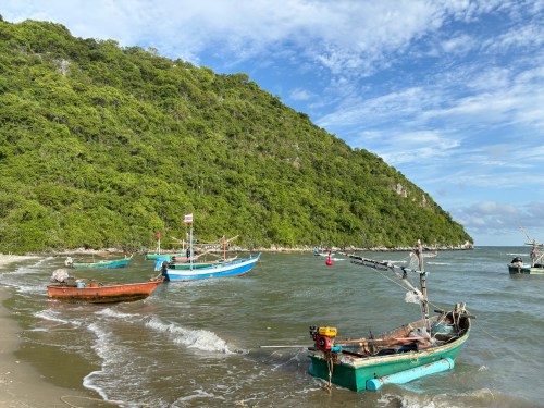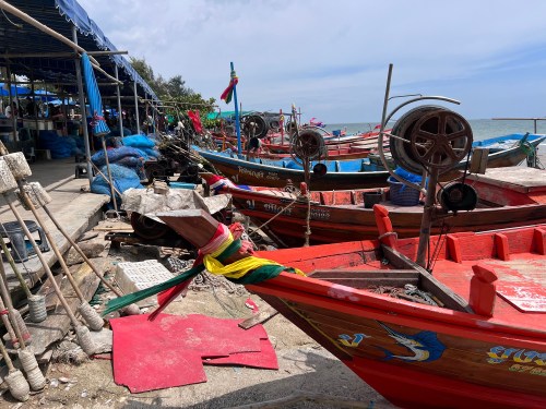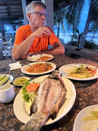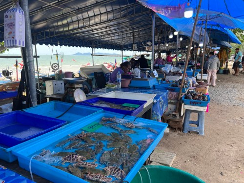 Next morning we head further east for 20km, turn off towards the sea and enter a different world. Beach to one side, local shops, a fresh fish market with the fishing boats drawn up behind each stall. This little strip at Rayong beach is completely different but close enough to hospital and other facilities we may need. There is an expat community which we meet at the Stay Cafe on Mae Ram Phueng Beach.