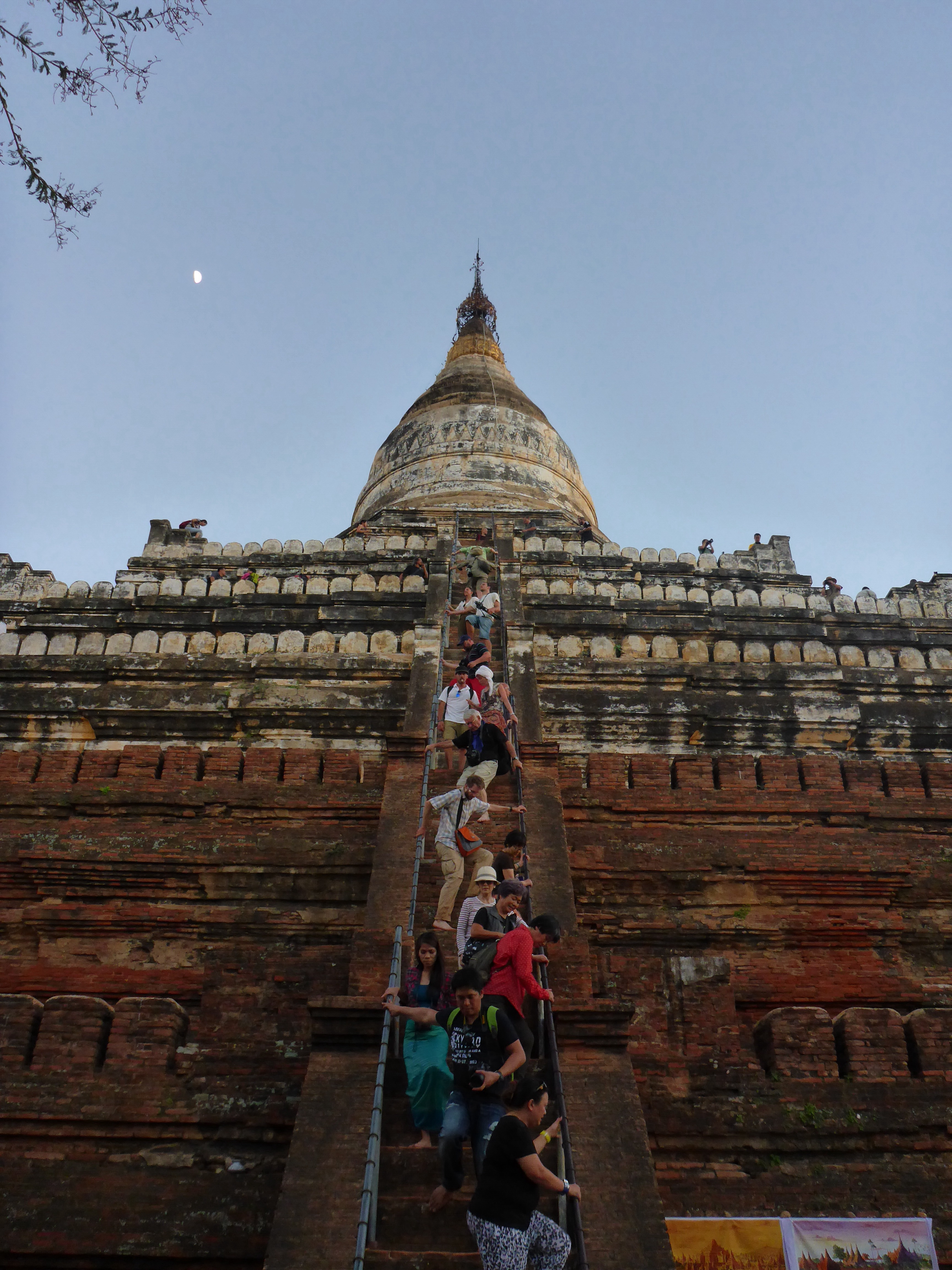 We can’t linger too long as we have to be somewhere else for the sunset so off we go. Now we get the biggest shock: there are coaches and coaches, thousands of tourists and sellers following us with their various wares, never taking no thank you as a final answer. It is dreadful. What are we doing here? We look at the massive pagoda and each level is covered in colourful ‘ants’. People everywhere!! Suddenly I worry about how Myanmar is going to be able to manage the obvious massive tourist influx, which we have since found out was 1 million in 2013 and expected to be 2 million this year.