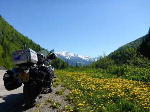 Further the road, after waiting for 20 minutes for roadworks, we travel on, colder and heavier snow. While pulling over might seem like an option, there is nowhere in the National Park to stop, a cold tent does not appeal and especially having to setup in this weather. We need to clean our visors of snow every 10 seconds or so, just to see where we are going, then splat! we are sprayed with a wall of fast moving slush by a vehicle going the other way, that’s a new experience for us.