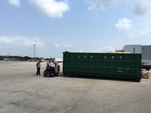 Breakfast is a funny mixture of western and local food. We try our first kimchi, pickled chilli cabbage, it gives a bit of flavour and a bit of a bite to otherwise bland food. By the end of breakfast, we can see that are growing to enjoy Kimchi already. The next day was another whole process made the more interesting by a series of ‘helpful’ signs – which office are we meant to go to?! Yet again, someone came to our rescue: one of the Korean Air Services staff organised a car to drive us to a building to collect the original Airway Bill. It would have taken us hours to walk there and back. Paid the warehouse charge and after returning to the first office, got more signatures and stamps, we were ready to be taken to the warehouse to receive the crates.