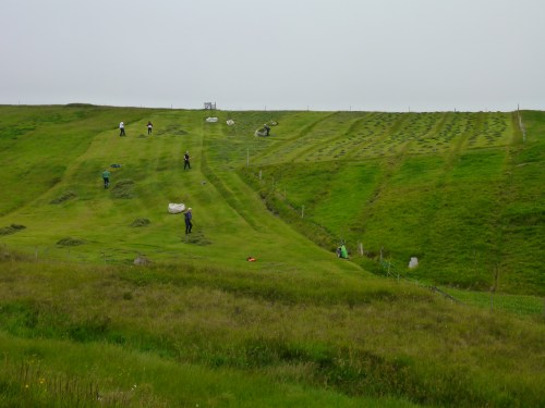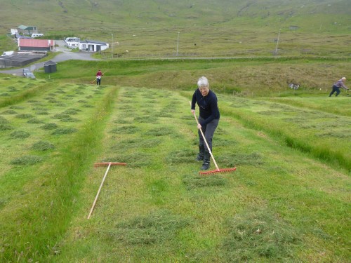 Well, I decided to go over and see what the process entailed and offered to help. They still follow the traditional Faroese process: after the grass is cut, it is first raked into little piles. Then you go back to each pile, turn the pile over, moving it away from it’s spot to allow the ground to dry, then spreading the pile flat again to allow it to dry. Because the weather was too damp, it was eventually decided to stop the spreading step and go to the next step of moving each pile into a single line down the hill. The next step involves pushing the central pile with the rake upside down, and pushing the grass into one massive pile which is then lifted into a large bale bag in a couple of easy swinging movements – that is best done by 2 people, each holding one bale bag handle, one foot standing on the edge of the bag and then scoop-rolling the hay into the bag. An hour and a half flew by. Because the hay and weather were too damp, the hay was then transferred to a drying ‘shed’ beside the campground. An old 1960’s car engine is used to heat the hay for 24 hours.