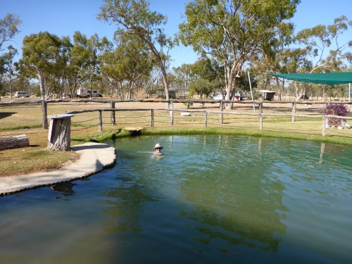 Roma is our last large town for about 10 days and the last in which we will have internet access with Vodaphone, our mobile provider. In the bush, Telstra is the only service provider as more than one telecom provider would not make economic sense. So for the next couple of weeks, we switch to our temporary Telstra sim card. Here also we meet a fellow traveller who has hired the same vehicle as us and could not work out how to open the fuel cover. We are used to a lever to pull in the car or just press the flap to open. He was stumped as we were initially. You have to open the passenger door to get the fuel flap open. He was grateful for our assistance. We also advise him the the ignition for the gas stove is linked to the range hood, go figure.