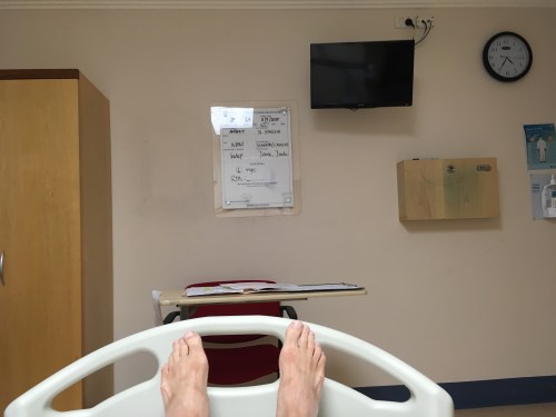 Noise and light, seems like I am waking up from an all night party at midday. The recovery room.  Great to be awake but boy do I feel seedy. An uncomfortable night follows as the anaesthetic drugs work their way out of my system.