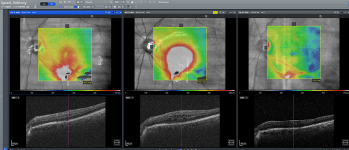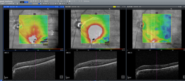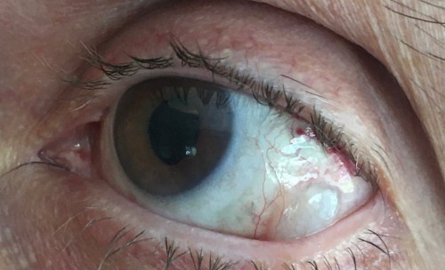 Where am I now? A little over a month ago at the end of March, I underwent a third operation, this time to remove the oil in my eye and replace it with gas again. This had always been planned, but became more urgent due to the oil causing my retina to become inflamed. We had tried steroid drops to control and reduce the inflammation a month prior but as the photo below shows this was not successful, so back under the knife again.