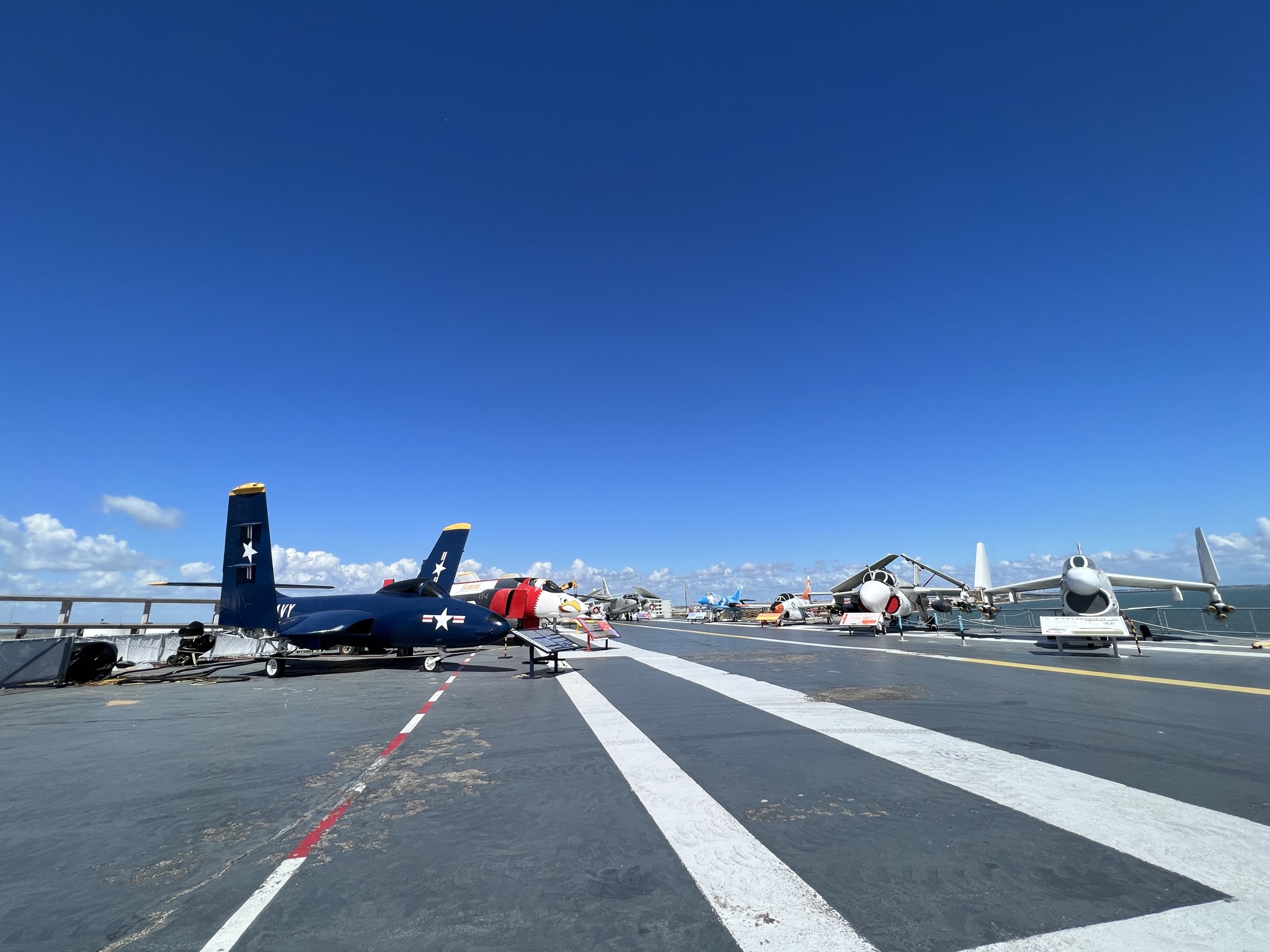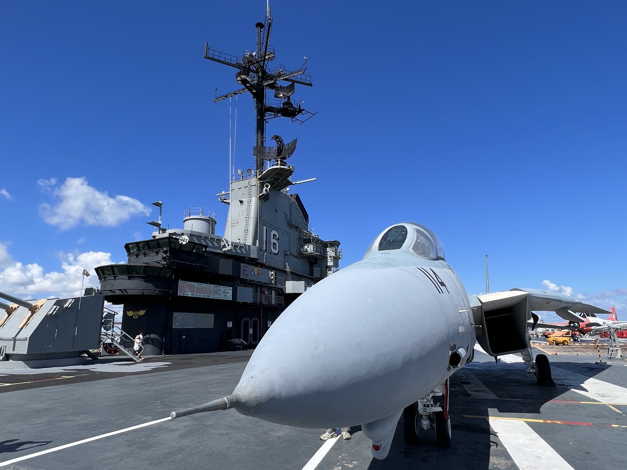 As one stands on the deck of the USS Lexington surrounded by jets from the modern era it is hard to imagine that the ship had been in service for almost 50 years starting with propeller driven aircraft through to the supersonic jet age. For those fans of the original 1986 movie “Top Gun” the F14A, serial number 160694, was the aircraft “flown” by Maverick (Tom Cruise).  The F14 looks as if it is ready to be catapulted into action sitting on one of the forward catapult positions on the flight deck.