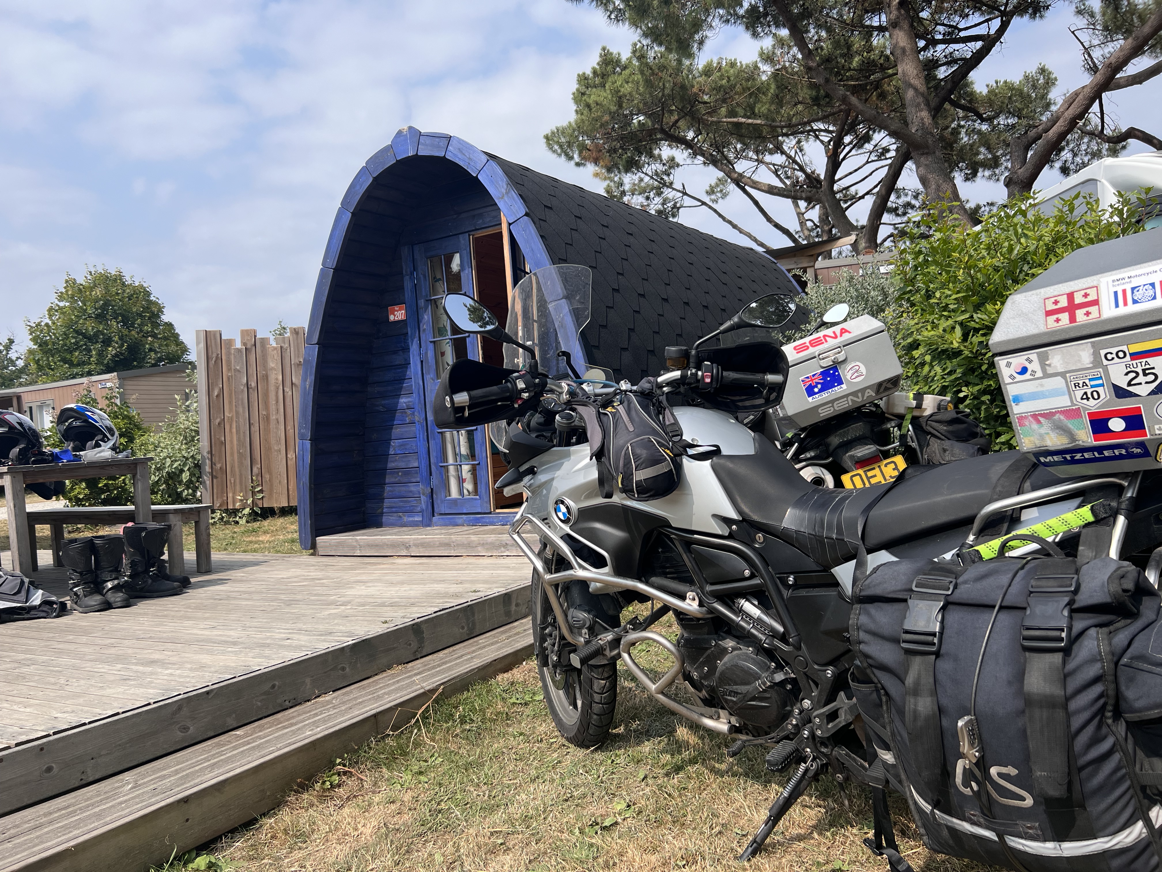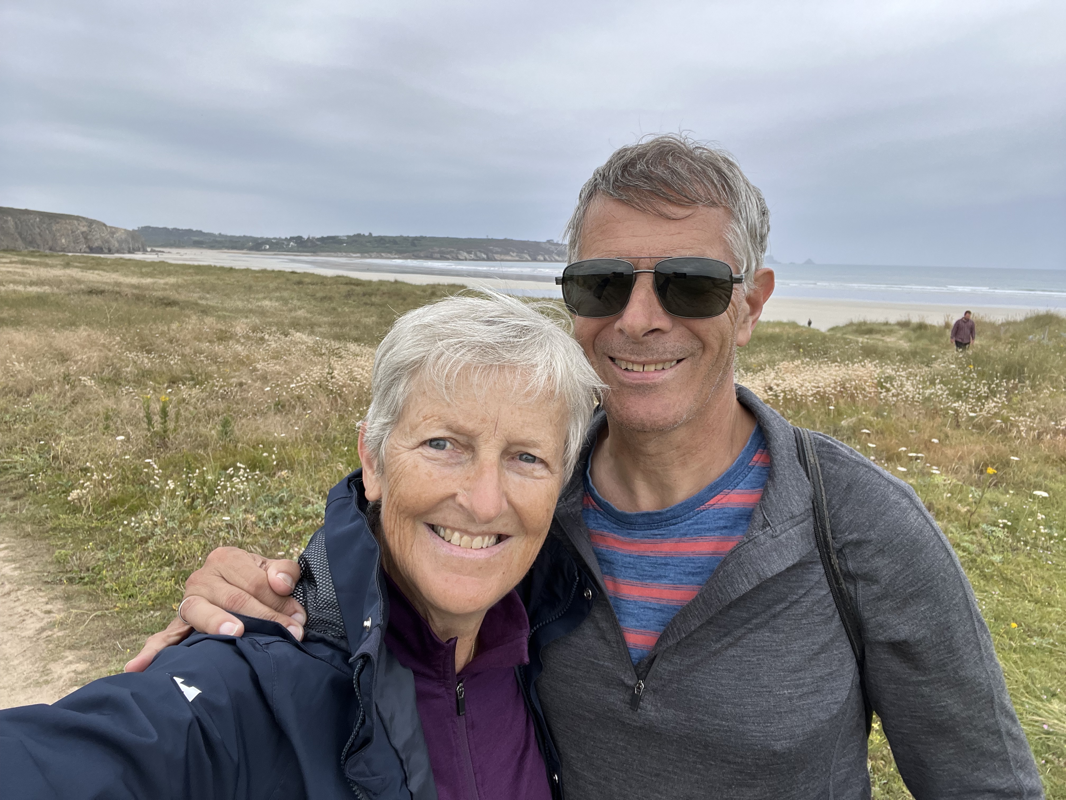 While we enjoy the riding, it is also important for us to walk each day, and not just in our riding gear! We are staying at a campsite on the beach outside Lamor-Barden, a small village with two restaurants and one ship – a campsite conveniently located between Vannes and Carnac, with costal walking paths starting from just outside the campsite. The weather forecast was not looking so good over the next few days, so we opted for a small pod instead of putting the tent up. After the first night and first breakfast of freshly baked and delivered flaky croissants (for Anne only) to the campsite reception, we decide to extend our stay by another day.