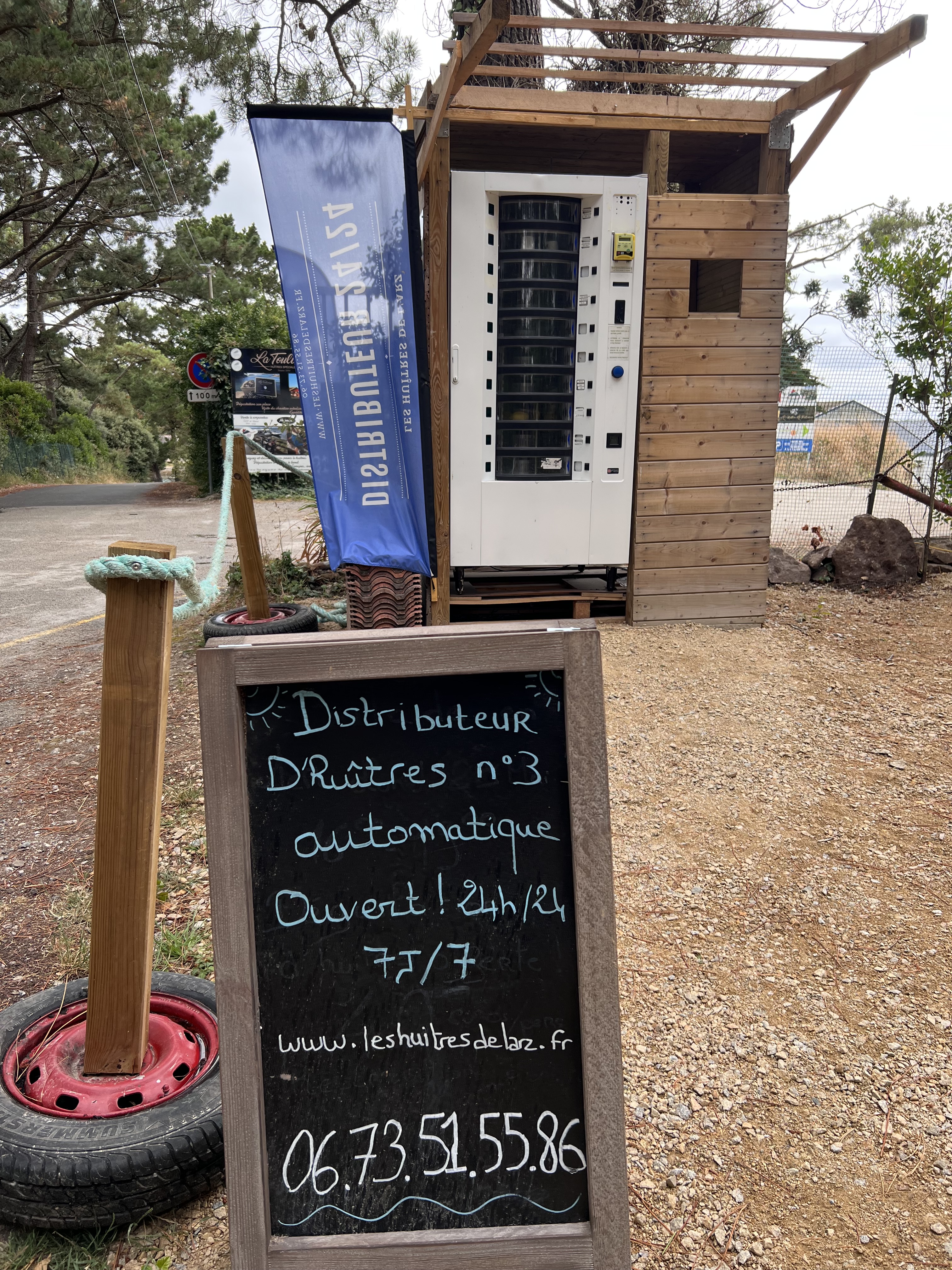 As tomorrow looks very wet again, we decide to stay a third night and explore the area further but on foot only. Today’s 12km walk takes us west of the campsite, along the coast line, past numerous oyster farms and back through a forest. Anne was not game enough to try this vending machine: it offered everything from oysters, lemon and rosé. What more do you need?!