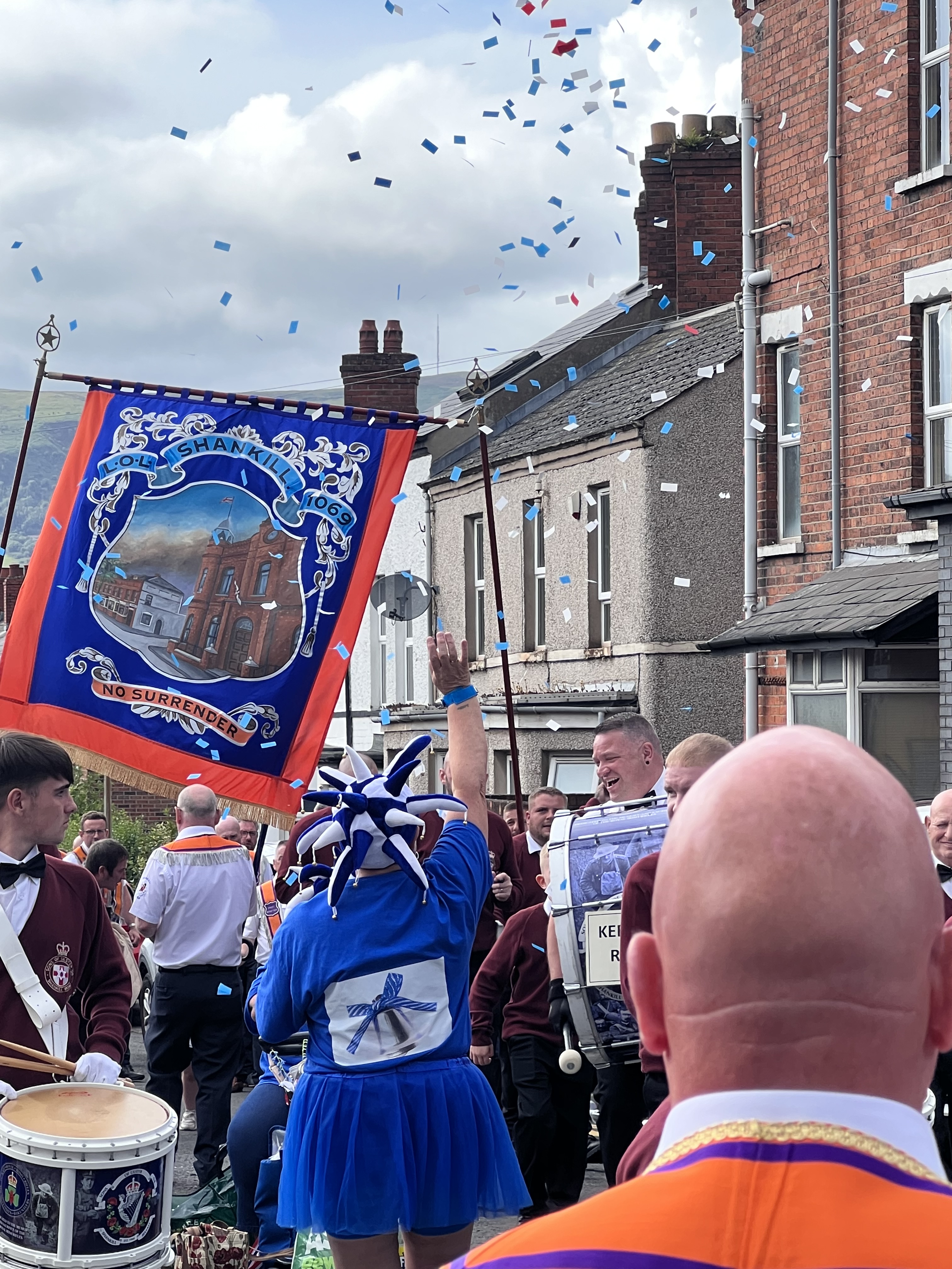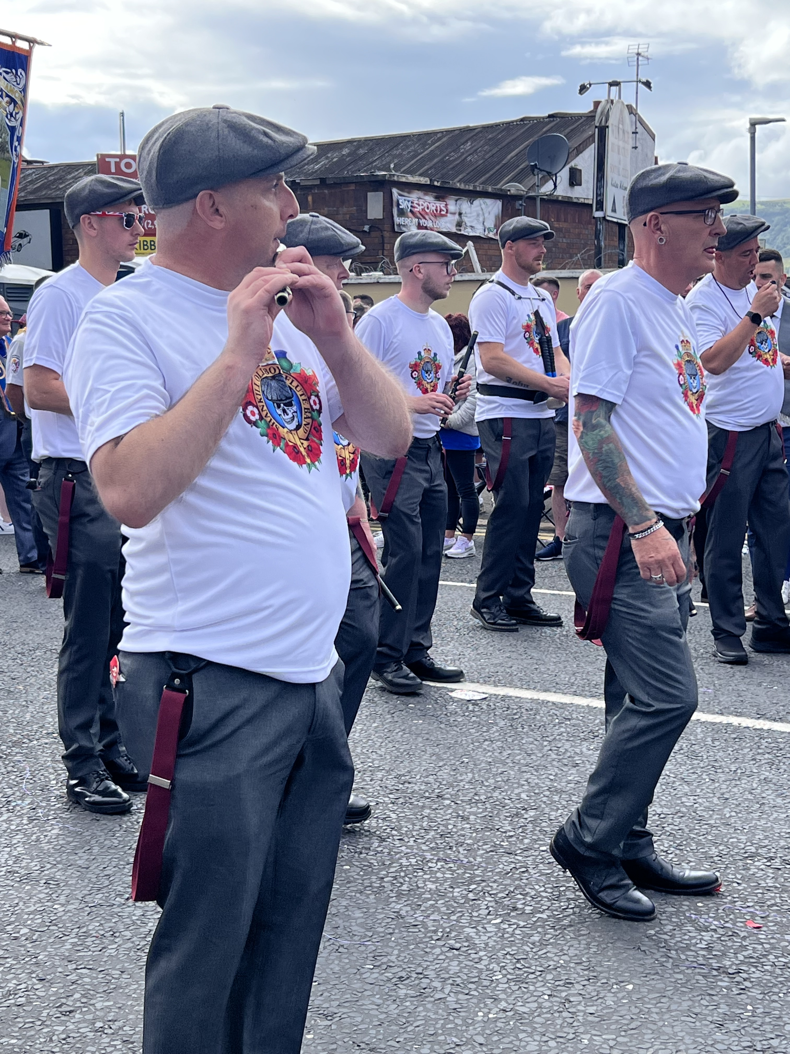 After lunch we wander down the Lisburn Road towards the centre of Belfast, where I presumed the marchers had gone, unsure about when they would return. Along both sides of Lisburn Road are small family groups, deckchairs in place for the return of the bands and marchers in the afternoon. It feels like a party atmosphere with children twirling batons high into the air and catching them. A local skill I imagine not replicated elsewhere in the UK.
