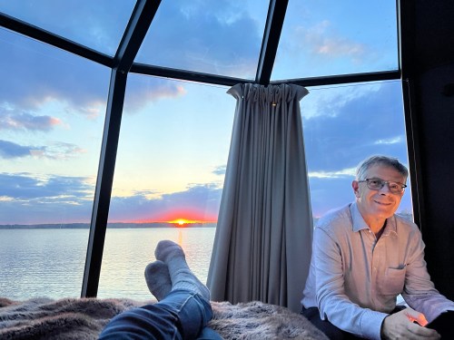 Entering the IGLUX reminds me of the Apollo space capsules, the door is at an angle and opens more like a hatch. Note to Elon Musk as he prepares the next Starship launch that the 2slowspeeds are still up for a little off world travel when we can no longer ride. Please keep us in mind Elon.  We settle into our own little igloo world looking out over a bay off the Baltic Sea.