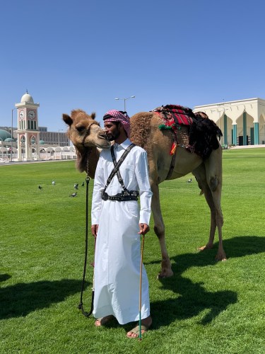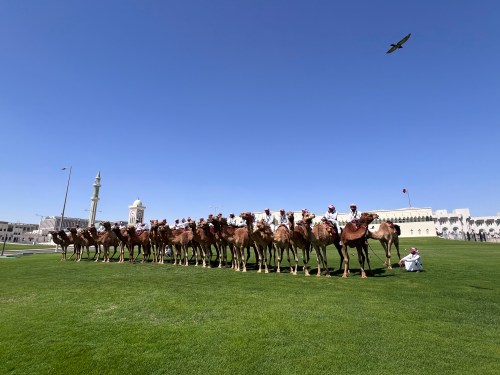 After a leisurely breakfast and a washing load (the apartment has a washer/dryer!) we decide to walk to the Falcon Souq (market).  There are very few pedestrians out as it is hot already!!  We wend our way to the souq, through the Souq Wakif Park first, and after first stopping for an unexpected sight.   The Palace Guard is out, lined up outside Amiri Diwan, which is the administrative office of the Ruler of Qatar. The Amiri Diwan is the seat of rule of the State of Qatar. It is the sovereign body and the administrative office of HH The Amir. It acts as a nexus between His Highness and all governmental and non-governmental bodies internally and externally.  The Palace Guard used to ride the most special and majestic camels, patrolling the area in order to protect their Emir (ruler).  Today, they are all lined up, happy enough for us and the 3 other visitors around to take photos. The guards eventually dismount, the guard nearest me and his camel exchange a kiss, and the whole group eventually leave the park and make their way back to the royal stables, a man diligently following behind, sweeping the road of any camel “gift”.