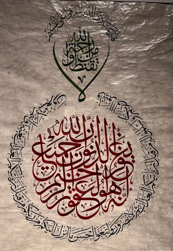 We are lucky that the Islamic Art museum is currently showing the results of the Al-Ragim International Calligraphy Competition, an international event organized by the Qatar Ministry of Endowments (Awqaf) and Islamic Affairs, in collaboration with the Museum of Islamic Art. The competition was designed to feature five distinct Arabic calligraphy scripts: Thumuth, Naskh, Nastaliq, Kufic and Diwani, each one with a jeli, or larger and decorative version.