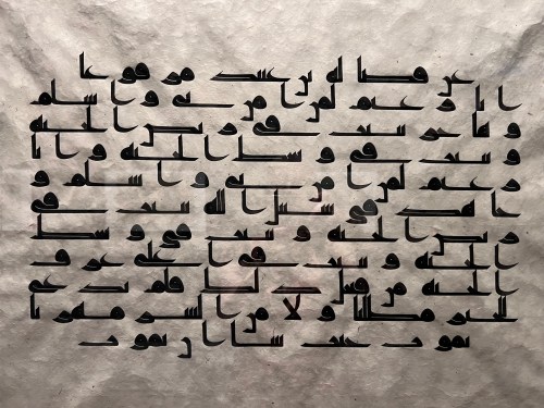 The Kufic script, one of the earliest forms of Arabic calligraphy, emerged in the 8th century, deriving its name from the city of Kufa in Iraq. Characterized by its angular, geometric letterforms with straight lines and sharp angles, as well as the absence of diacritical marks, it was extensively used for transcribing Quranic manuscripts and adorning architectural monuments. Over time, Kufic evolved into various styles, including foliated, knotted, and square Kufic, each distinguished by unique decorative elements. The oldest known inscription in an Islamic monument, using this script, adorns the interior of the Dome of the Rock in Jerusalem, dating to 691-692.