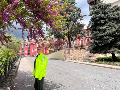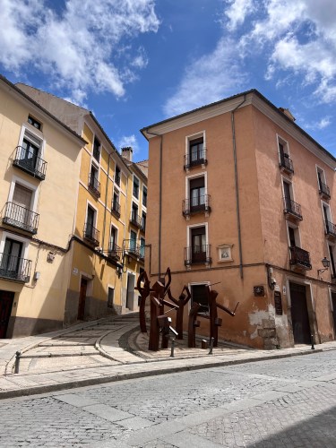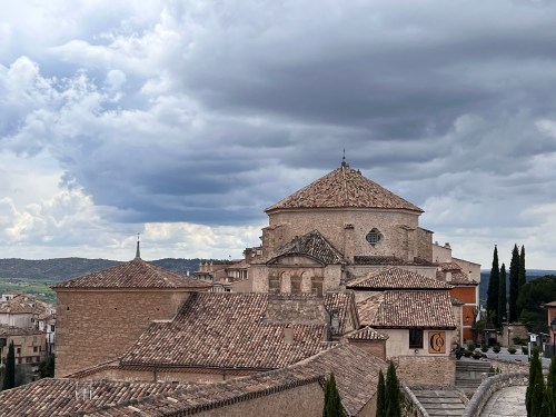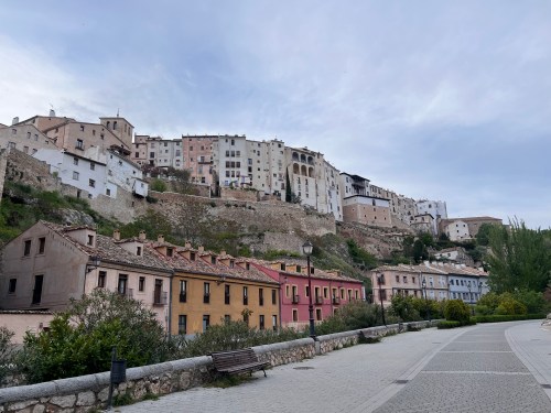 We leave the highway and onto the smaller roads we prefer as we head for a planned lunchtime stop at Albarracín. As we approach, the ever darkening skies portend heavy rain later in the day. Our final destination is only 100km away but the twists and turns en route it will take us two hours. A snap decision, we do not want to ride wet and cold on mountain twisties, Albarracín will have to wait for another day. Through the tunnel under Albarracín we go. As we wend our way up and down over various passes towards Cuenca, the temperature drops as we cross each pass at one point the sign says 1685 m which I take to be metres above sea level, over 5,500 ft. We avoid most of the rain (although we did stop to don our waterproof jackets) and arrive some two hours later as predicted. I would not want to ride any faster thanks. Although cold, what a fantastic ride, through ever changing scenery, perfect curves and very little traffic.