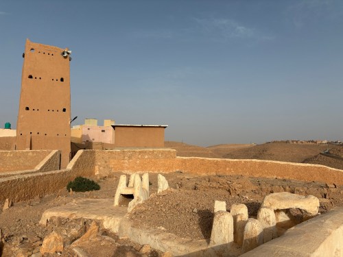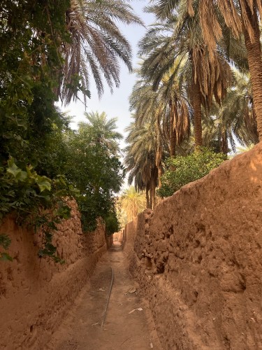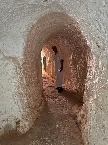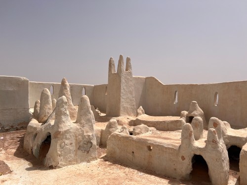 Hamid points out various cultural, environment and defensive designs adapted throughout the pentapolis.  For privacy,  front doors don’t face each other. All buildings are the same height so that one does not look over and into a neighbour’s house and roughly the same size.  I had read that the wall coating is designed to create as much shade as possible thus reducing house temperatures by up to 20 percent.  The walls are covered in little bumps created by first painting the walls with wet clay then thrashing them with the empty date branches. Streets are curved so that winds and sand storms can’t funnel down a street as they would do if straight. The dead ends are to confuse intruders or invaders. And there are no cars within those ancient walled cities.   It is not difficult to see why these ancient cities should be a source of inspiration for urban planners today.