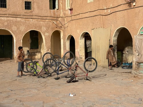 A wrong turn in the guts of old Ghardaia sends up a narrow lane, hairpin bend up another steeper lane to find out we’ve arrived at the back of the hotel. A quick U turn and we head back down, nearly into a reversing car on the sharp bend. Anthony swerves to avoid the car and we encounter our first unhappy driver shouting “il en enfoiré c’lui la” at me!!  (He’s crazy that one!).   Finally at our hotel having reversed our bikes off the road, I am totally exhausted and out of breath. This 37 degree heat and exercise is reminding me of my age these days!!