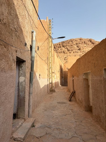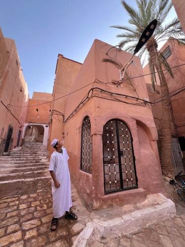 Rachid stopped us in the souq – he is a lecturer here and was shopping. Welcomed us to Ghardaia as all Algerians we cross do, chatted about his job and interest in renewable energy then took us to a drinks shop and bought us 2 cups of a local drink:  Takerwait, a traditional Algerian beverage from the M’zab Valley, is made from a blend of natural ingredients, primarily dates, citrus fruits (like lemons), and a variety of herbs and spices. Specifically, it often includes myrtle flowers, marigold, and other aromatic plants. The infusion is typically sweetened with sugar and known for its slightly bitter and spicy flavor.  It was very tasty.