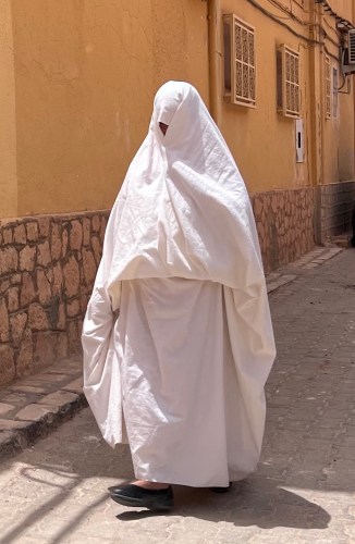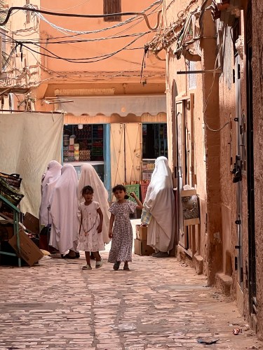 As we walk around Melika, I know not to take photos of people but really wish I could.   Especially of the Mozabite  women who wear a white shroud totally covering them but for one eye if they are married. I eventually mention this to Hamid who tells me that so long as it is taken from a distance, that was ok which is what I did. Here are a couple of cropped photos.