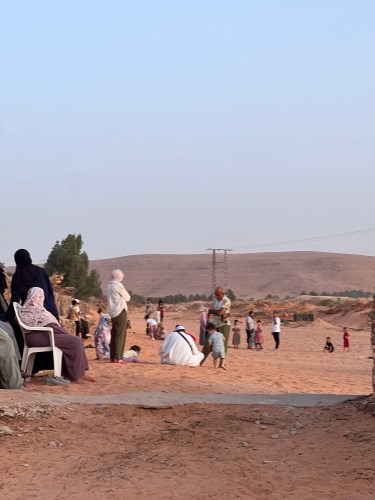 As we were driving back in the dark, I noticed what looked like thick low cloud or a mountain range in the distance which I knew wasn’t there. I point it out to Anthony as it seems so strange. 5’ later the most violent wind picks up whirling sand all over the place. I thought our sandy wind a couple of days ago was bad – this is heaps worse with visibility near disappearing for a time and impressive buffeting of the car.   At least Hafid did momentarily slow down – not a comfortable ride with no seat belt, at 110kms in the dark up and down mountains. Thank goodness for the smaller places as we get back closer to Ghardia and have to slow down for the hundreds of speed humps.