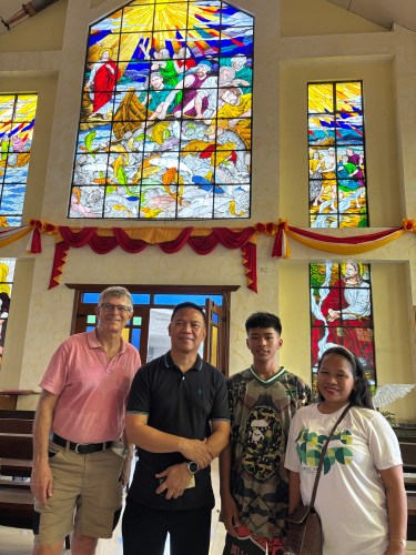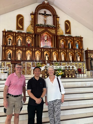 We arrive at the church of “San Lorenzo Ruiz and Companion Martyrs Parish Church” and are given a warm welcome by Delilah and our nephew’s godson JM. We meet the Rector and Parish Priest Rev Fr. Allan V. Lopez, also a Dominican, who had worked with Matthew previously and spends time to show us around the church. The parish was only established in 1982 and the current church building more recent than that with major renovations done following a flooding. It was interesting to see the local features such as the Altar of Saints and some of the, unique to this Church, adornments built into the ceiling that reflected the local culture.