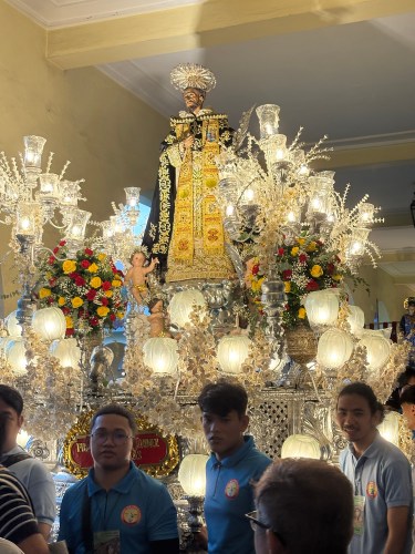 As we follow Fr. Allan through the cloisters, past the elaborate floats, each holding a sculpture of a Dominican Saint, and into the seminary, one can feel the mounting anticipation as the time of commencement approaches for the thousands faithful gathered both inside and outside the church.