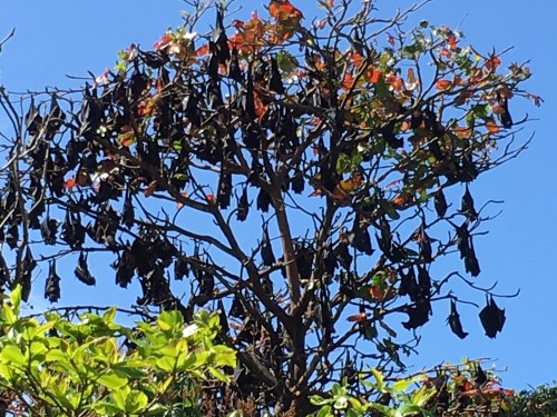 A leisurely lunch with the weekend papers and then back to our neighbourhood bats for a raucous early evening departures and an equally loud early morning return.