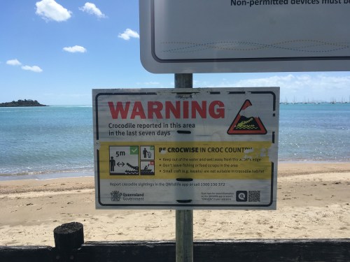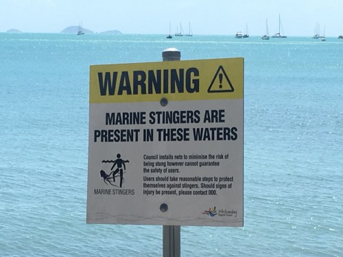 We enjoy walking on the foreshore although entry into the inviting blue sea is tempered somewhat by the signs posted along the beach. Our glorious Queensland coastline come with a couple of unwelcome additions, just add water.