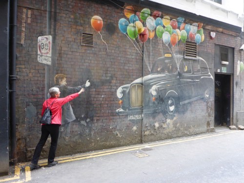 This fun one of a taxi floating at the end of a bunch of colourful balloons is so detailed, the artist, Rogue-One, even painted the bricks onto the brick wall! Thank you to all the drivers who stopped to give me space to step back and photograph this taxi in the narrow lane way.