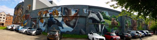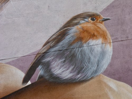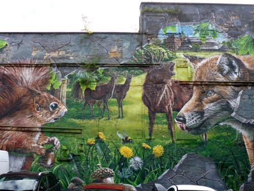 The most impressive mural to me is the one by Smug, Sam Bates, in what was once a delapidated car park, depecting all sorts of local ‘residents’ found in parks and green spaces, as if appearing through cracks in the wall, throughout the seasons. The longer I spent looking at it, the more detail I found, right down to the identical reflection of the church facing the wall in the squirrel and wolf’s eyes and the berry on the ground which the blue tit is eyeing.