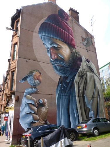 As you will have seen from Anne’s post on street art in Glasgow, the fourth in the series following those on Malaysia, Santiago and Reykjavik, there is an amazing variety of work on display across the centre of the city, as usual in so many odd and unexpected places. Our search is quite interesting as we do not know if the paintings we are looking for are one meter or 20 meters high. It does take our first day exploring to find both those on the offical lists and quite a few unexpected new additions.