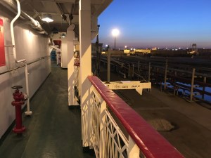 We ride to the port, only 3 km / 2 ml from our hotel, but as we avoid riding at night wherever possible it’s a strange feeling riding in darkness and as we arrive at the port we realise that the empty railway tracks we had seen in daytime that criss cross the port roads are alive with shunting activity at night. Rider/driver beware.