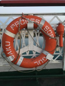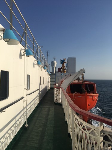 A calm sea greets us when finally awaken in the early afternoon. The cabin is warm, the newly installed air conditioning system is not working, I hope better goes for the lifeboats, at least they have a checked date of 16/07/2017 painted on them from the last major overhaul. Luckily, we can open our window and our cabin door does not close so we have a through draft. Hopefully we will not need our Personal Location Beacon (PLB), a smaller version of an EPIRB, which we have dug out the top-box just in case.