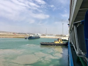 After registering our bikes and us, at two separate locations 11kms / 7 ml apart, port and city respectively, we spent three days in Aktau, mostly relaxing at our resort hotel as we waited for the call to say a ferry is on its way. This we understood is standard practice here as the local offices have no idea which ship is coming until it departs from Baku, and seems to depend on the demand from trucks wanting to cross. There is no schedule. When we left the port, I noted some 30 vehicles on the screen in the port office, but only 24 were scheduled to board that night.