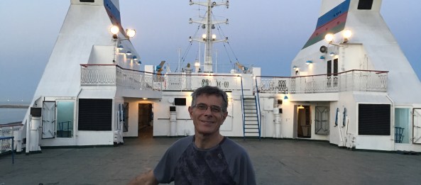 A calm sea greets us when finally awaken in the early afternoon. The cabin is warm, the newly installed air conditioning system is not working, I hope better goes for the lifeboats, at least they have a checked date of 16/07/2017 painted on them from the last major overhaul. Luckily, we can open our window and our cabin door does not close so we have a through draft. Hopefully we will not need our Personal Location Beacon (PLB), a smaller version of an EPIRB, which we have dug out the top-box just in case.