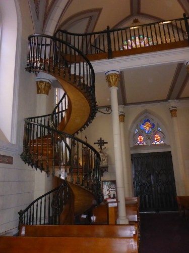 When one sits in the Loretto Chapel in Santa Fe, the vision that surrounds you is that of a French Church. This is made more believable when you are told the architect is French, Antoine Mouly, and that the stained glass windows are from France and the altar, organ and other fittings are from France and Italy. The most interesting aspect of the chapel, and the reason for its fame, is the double helix spiral staircase which gives access to the Choir loft. The architect died while the chapel was under construction and upon the chapel’s completion it was realised that no staircase had been built to access the choir loft some 20 feet / 6 metres above the chapel floor. Since the chapel was small, a normal staircase would take up too much floor space, and the Sisters of Loretto, not confused with Mother Thersea’s Sisters of Loreto order, whom the care of the church was entrusted to, did not appreciate the proposal of using a ladder in their habits! All the local carpenters do not have a solution to the problem, so the nuns decide to pray to St Joseph, the patron saint of carpenters. On the ninth and last day of their prayers, a unknown carpenter arrives and offers to build their staircase. We understand he worked with only the most basic of hand tools and spent three months building this amazing self supporting staircase then left with out asking for any payment. The nuns believed that their prayers to St Joseph had been answered and who can doubt them. It should be noted that the staircase originally had no handrail, which both the nuns and I found a little unnerving. The handrail was added a few years later.
