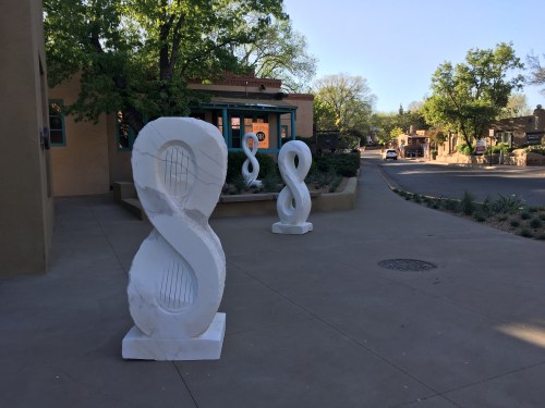 On our final day in Santa Fe, we visit Canyon Road, famous for a variety of art galleries and a must see place for visitors. We wander along the street and nothing catches Anne’s eye to entice her in until we see a large gallery space that appears to be setting up. We are invited in and meet Kiyomi, Joseph and Jesse who are preparing the gallery for its opening next week. They have created a great exhibition space, perfect for an Aboriginal art exhibition? Who knows, anyway we learn that a series of five marble sculptures will be craned in at 6 am on Monday morning, yes you guessed it, we are staying another couple of days to see this. Will we ever leave Santa Fe?