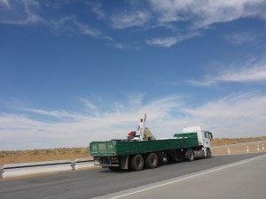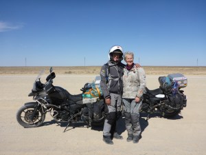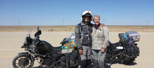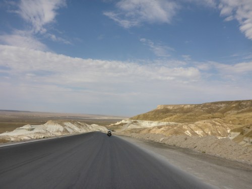 We are some 20 ml/32 km from our final destination in Kazakhstan, the port of Aktau, where we will board a ship to take us across the Caspian Sea to Azerbaijan. I glance down at the GPS and see that it has turned into a depth gauge, we are already some 70 meters below sea level! I quickly hold by breath, check for oncoming water from the Caspian Sea that towers above us somewhere ahead at only 27 meters below sea level and try to remember any anecdotal diving information from a friend over long dinners and good red wine back in Manly. Reality returns to my befuddled brain and I I realise I do not need to add a snorkel or oxygen tanks to the fuel and water containers that festoon Streak and Storm, Phew! We are in or close to the Karagie Depression which reaches 132m / 433 ft. below sea level and is one of the lowest points in the world. The name translated from Kazakh is “black hollow”, although the landscape is white and yellow. There are also many reported UFO sightings in the area, although today I think we are the only aliens around.