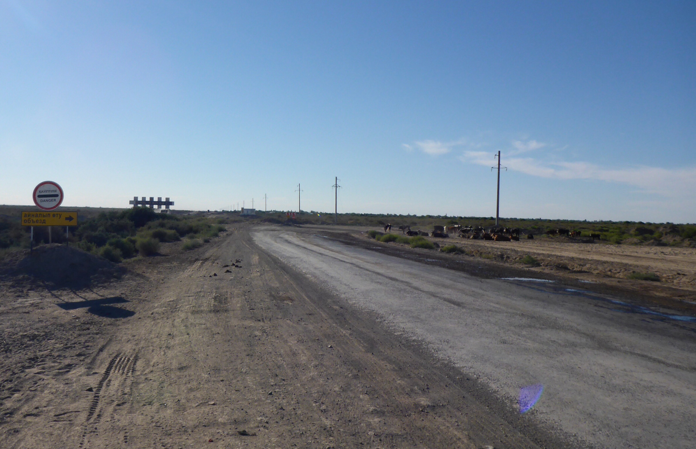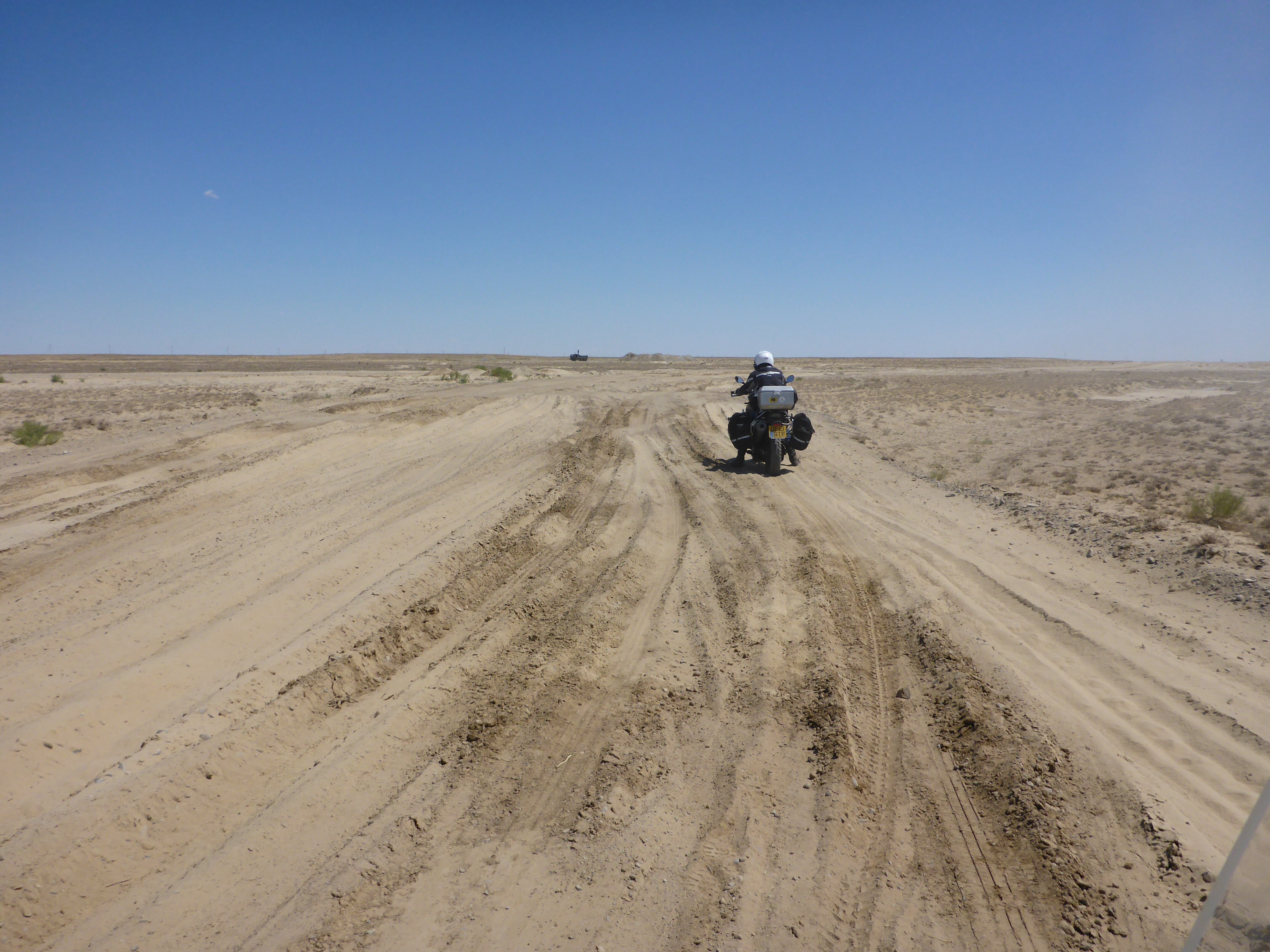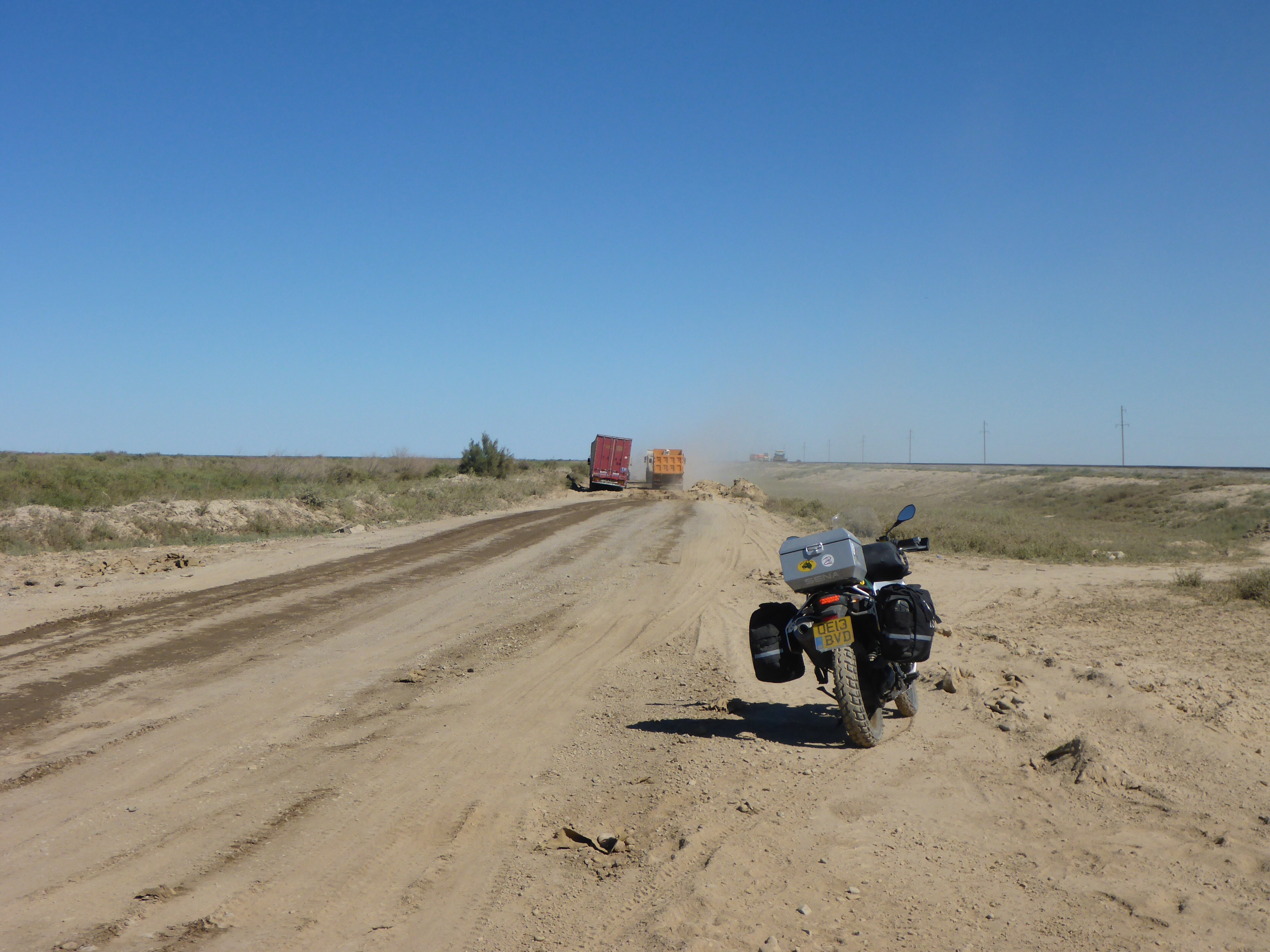 The road from Kyzylorda to Turkistan was mostly incredibly good. Luckily, we’d been warned by the Irish couple we’d met the day before that the speed limit was not what one would expect on a double highway and the cops issued speeding fines (they got 2 in a row) so we were very careful (of course, as always!!). The reduced speed limit was because there were “road works”, although we didn’t see many, except for the fact that the crash barriers in the middle were not finished. Great way to make easy revenue!!