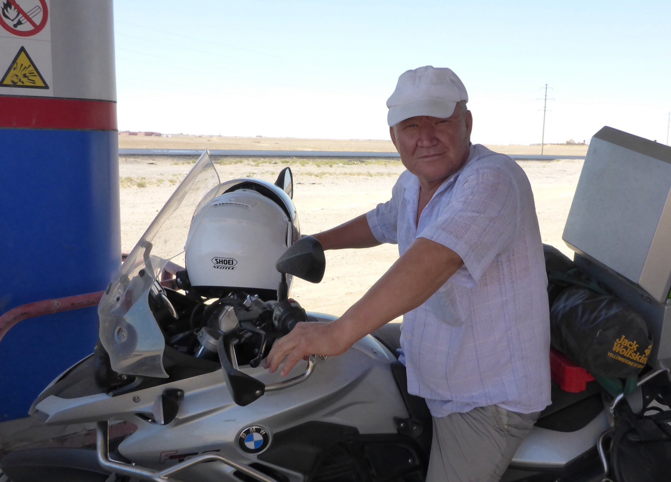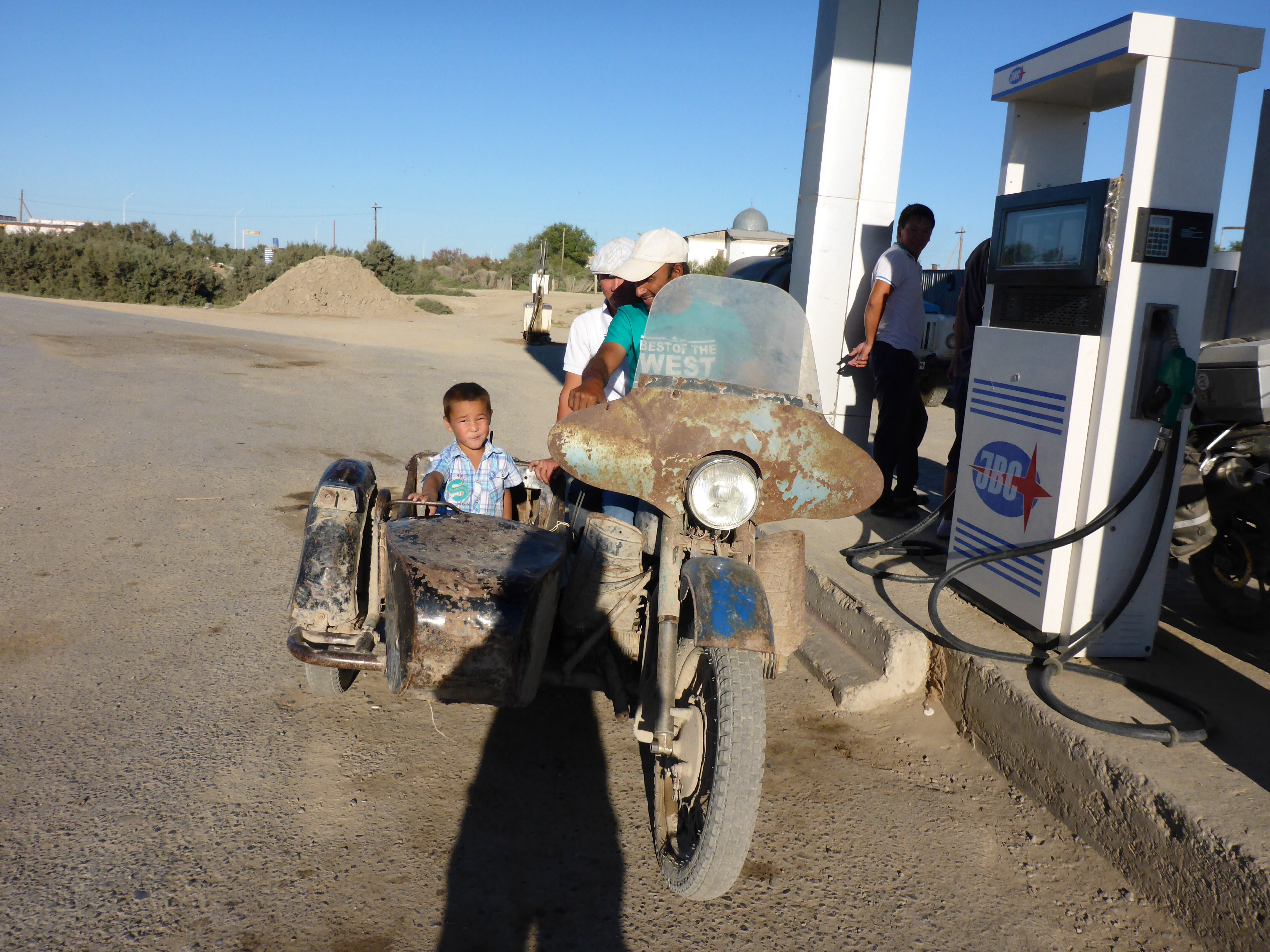 Just after a mid afternoon lunch, we stopped at a petrol station to refuel, on the outskirts of Aqsu. This is where we experienced the wonderful Kazakh hospitality. The petrol station owner, Cirik, invited us to have tea so we accepted. He was such a sweet man. He showed us to a table and invited us to sit. He cut a watermelon in two then chopped the insides into bits, gave us a fork each and invited us to eat. Another man broke up a large loaf of bread into chunks for us. He told us that to him, it was a priviledge to invite us. We hope he realised what his hospitality meant to us! Then we washed 2 cups with his hands and served us tea. He was 48, had 10 kids, works the land, grows watermelons, makes the bread and generally works very hard. When we left him and his team, we left a little bit of our hearts there with him.