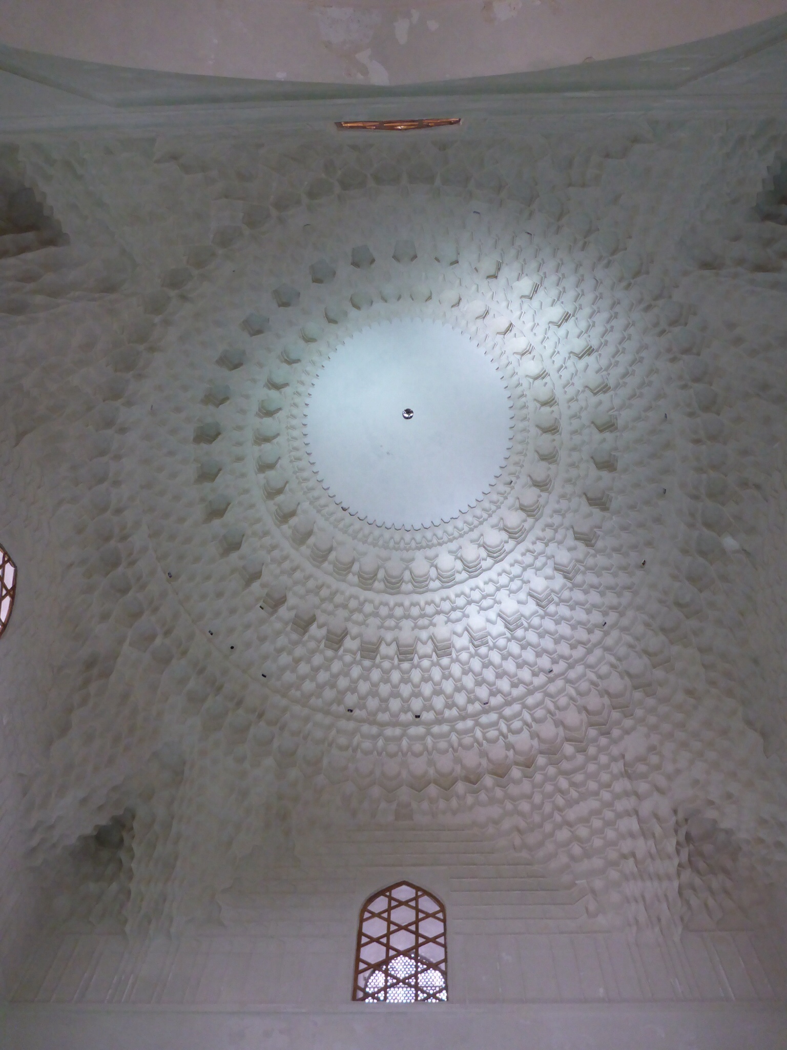 The Mausoleum of Khawaja Ahmed Yasawi, Turkic poet and Sufi mystic Khoja Ahmed Yasawi (1093–1166), is an unfinished mausoleum commissioned in 1389 by Timur, who ruled the area as part of the expansive Timurid Empire and died in 1405. Its creation marked the beginning of the Timurid architectural style. The experimental spatial arrangements, innovative architectural solutions for vault and dome constructions, and ornamentations using glazed tiles made the structure the prototype for this distinctive art, which spread across the empire and beyond, such as renowned Samarkand. The religious structure continues to draw pilgrims from across Central Asia. UNESCO declared it a world heritage site in 2003.
