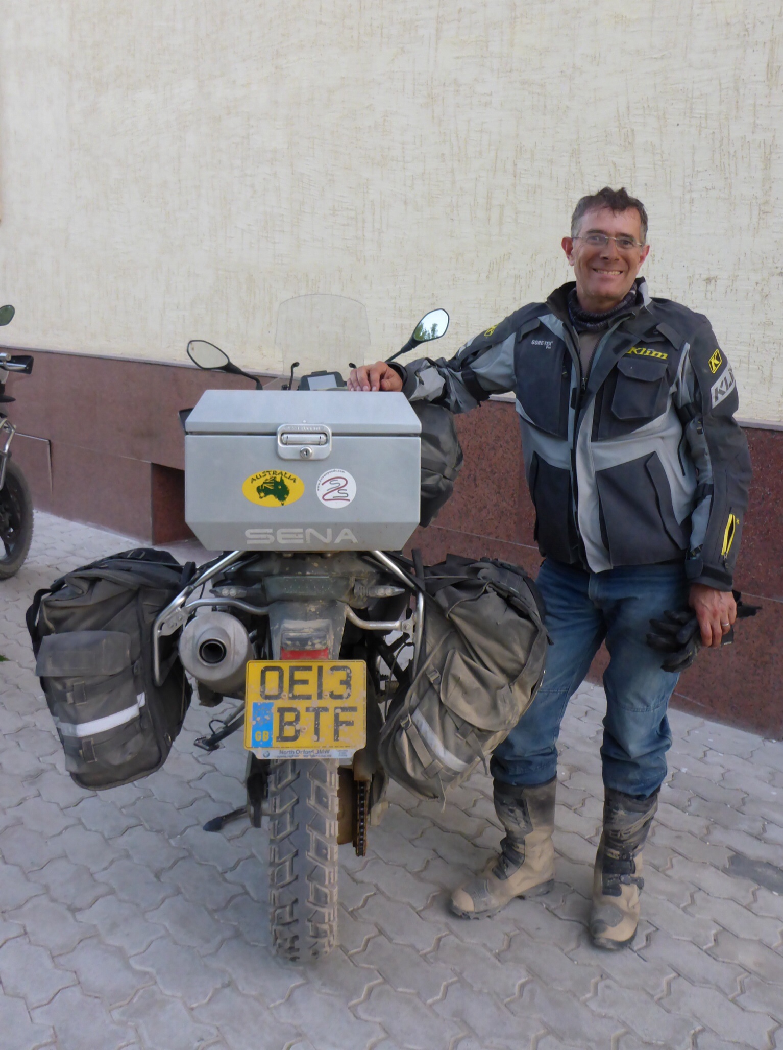 We kept having to stop and take regular breaks. We got to know the trucks on the road: they nearly all hooted at us to say hello as we overtook them, then, as they went past us while we were stopped, they’d wave and hoot again. And so this continued a number of times with the same vehicles. The Kazaks are incredibly friendly. Sometimes, as we were pulled over, some would stop and chat, ask if they could take photos and then move on. Several cars would also drive up slowly beside us, and wave while another passenger took photos!!! Responding to all the hellos was fine on the tar but not always easy to respond to while tackling the tricky potholed and twisty dirt sections!!Once again, we strike it lucky. When we arrived into Turkistan at around 7pm, we couldn’t find the first 2 hotels on our gps – the first one disappeared after the bypass was constructed, the 2nd one, who knows?!… During our hour of riding around Turkistan, I kept my eye out for a mausoleum I wanted to see. Anyway, we were stopped outside the 2nd address when a group of Kazaks called us and came over, wanted photos and generally wanted to find out about where we were from, where we were going etc. So we asked if they knew of a hotel. Yes, go to the Yacci, left then right then straight down – not sure if it was on the left or right. So off we went and we found it. As we stopped outside the Yacci hotel, Anthony asked me if it was close enough to the Mausoleum for me. It was right there!!!! Incredible. And we got a room with a view towards it!!