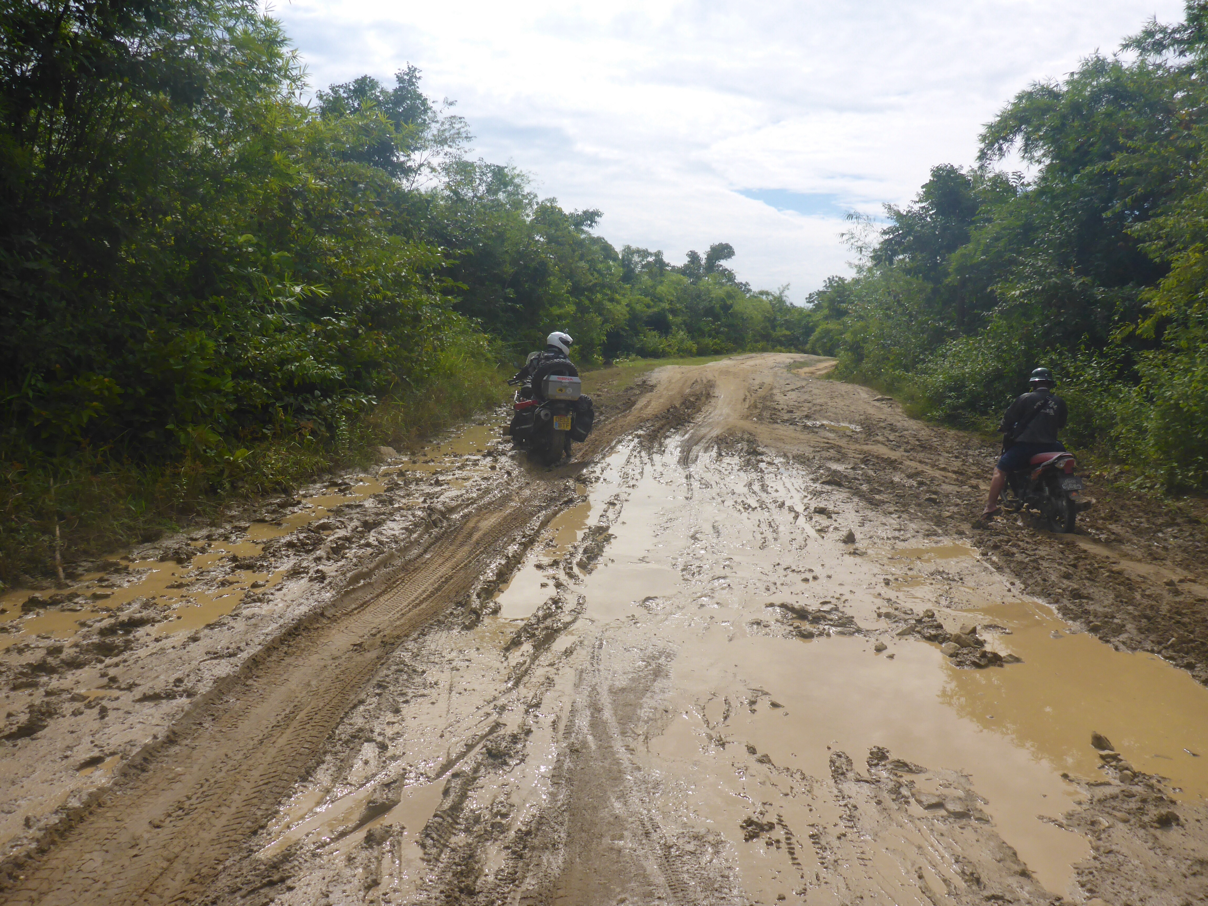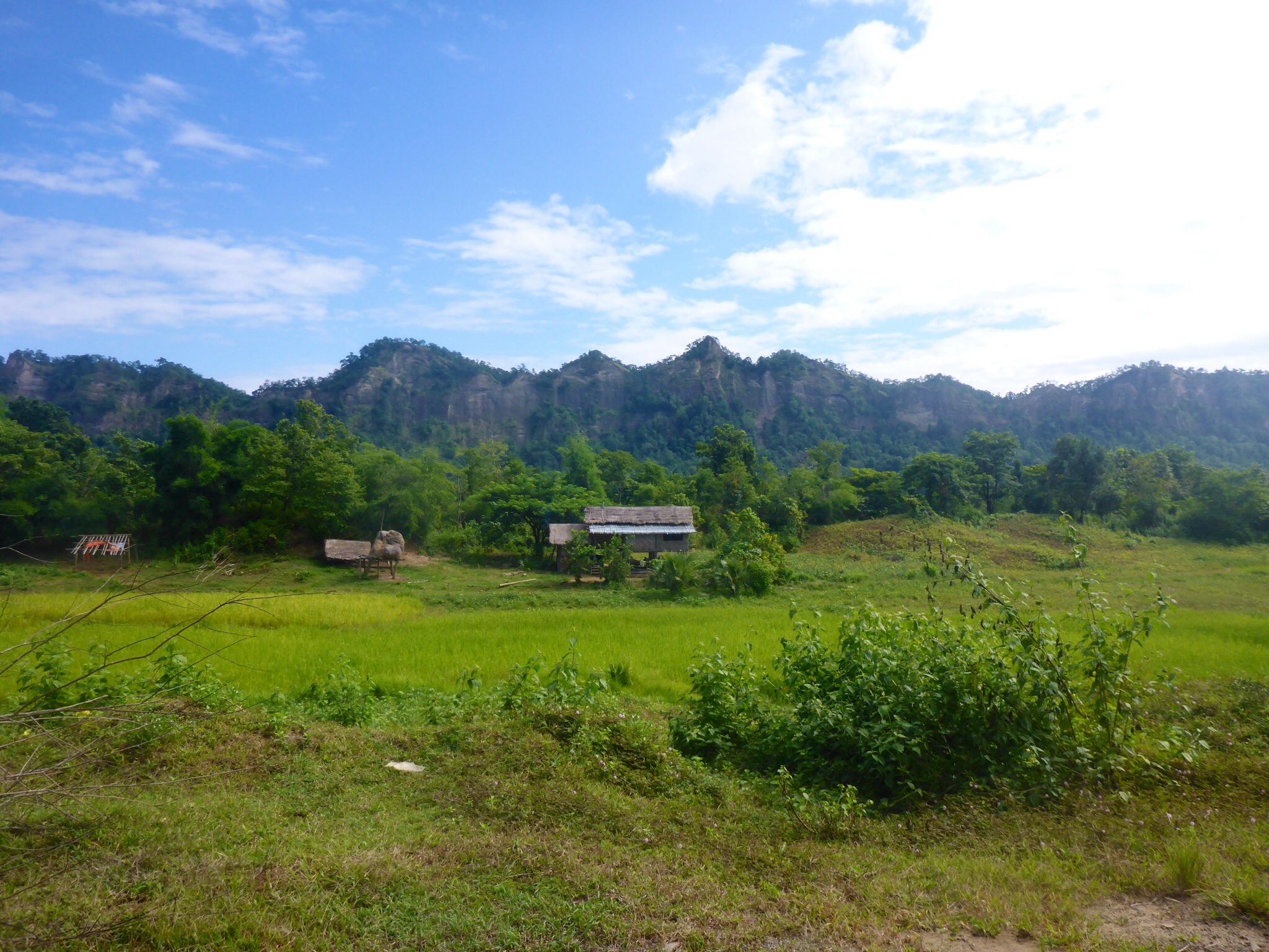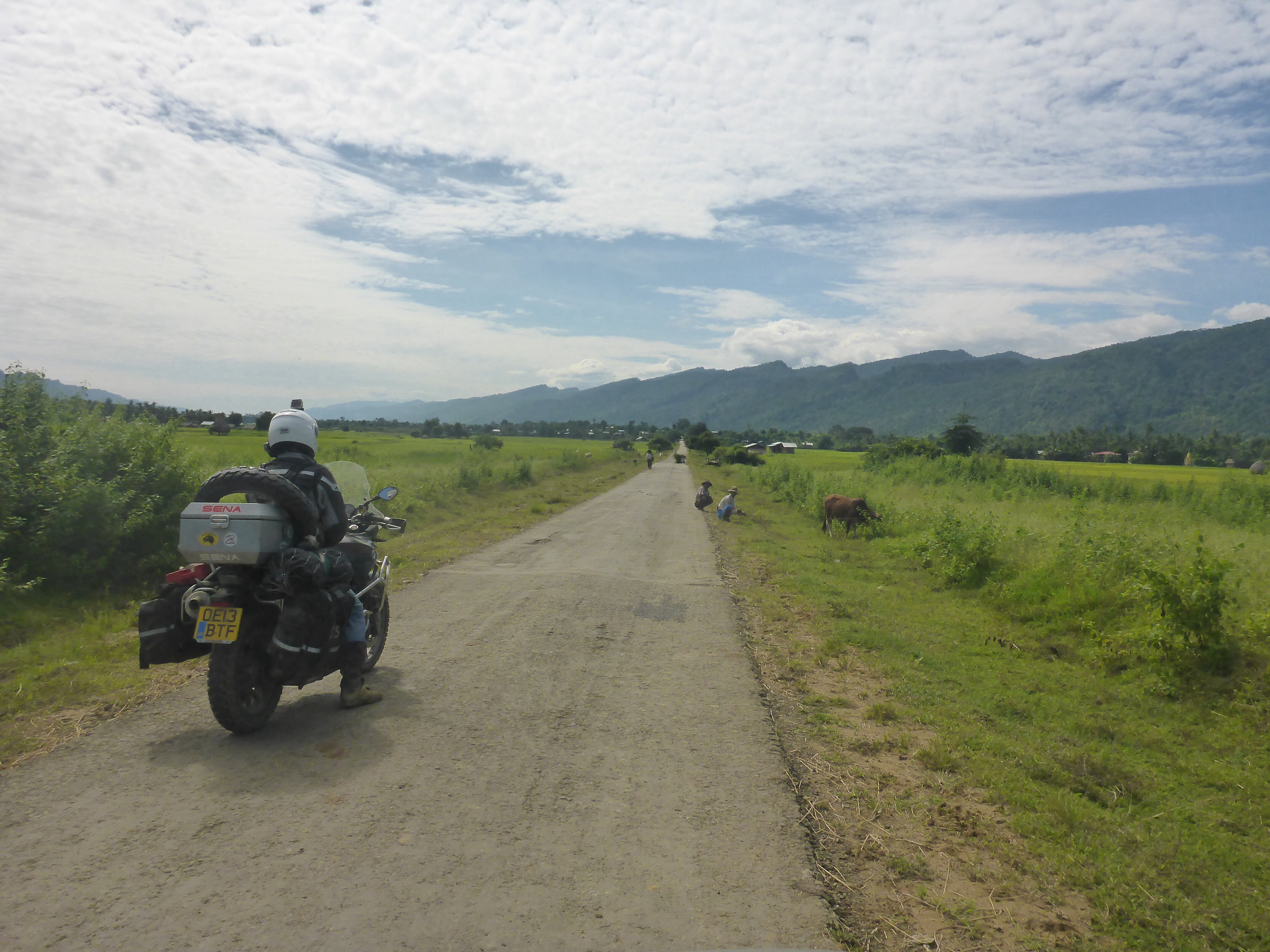 All riders soon catch us up at the bridge, the water issue on Joe and Rolfe’s bikes having been resolved. Our first glimpse of mud greets us as we ride off the bridge, then a idyllic valley unfolds before us as we travel south. Jagged hills run parallel to the road on each side of the valley, a river meanders between green fields filled with rice and other crops. Ox carts creak along the road carrying a variety of supplies. The local people wave and smile as we pass. We could have just stopped, setup the tent and stayed a few days had we not been in a group.