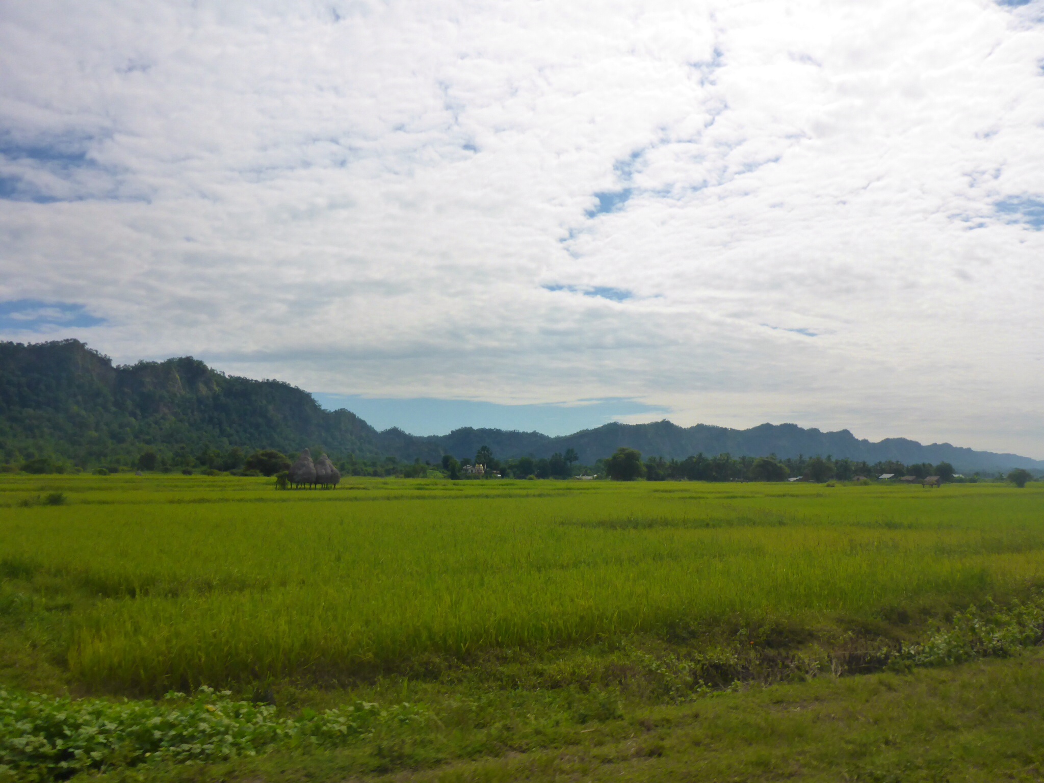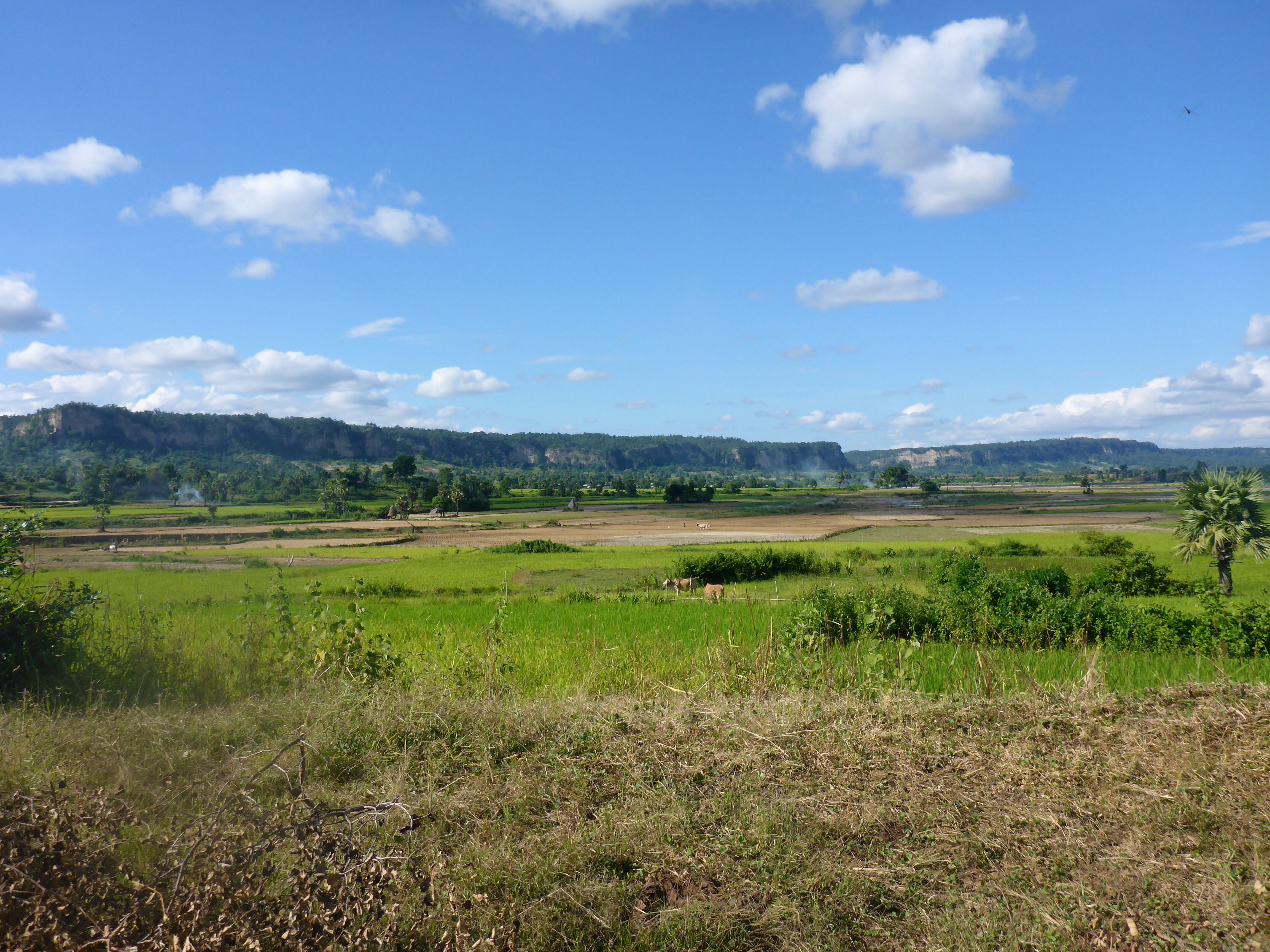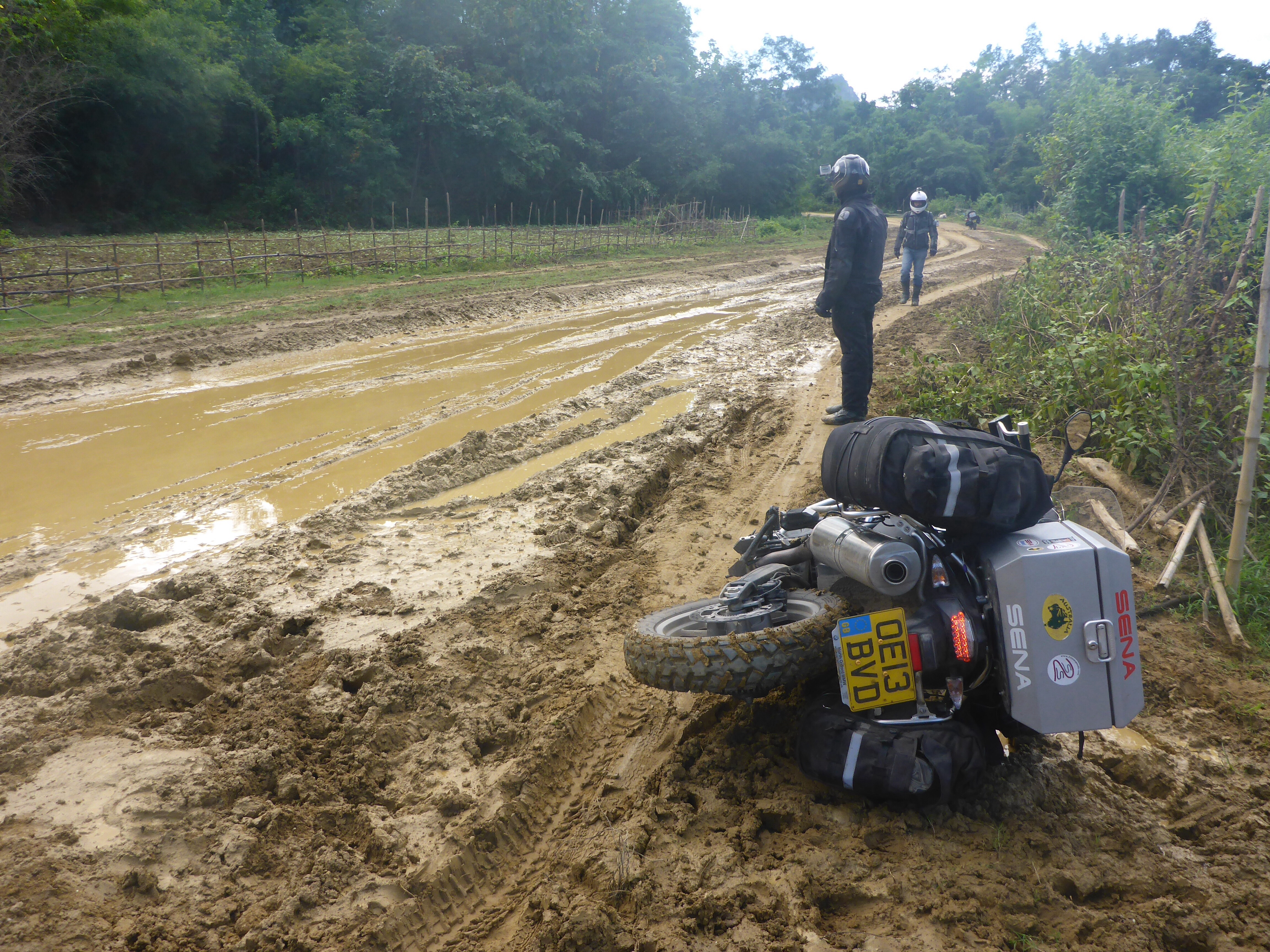 All riders soon catch us up at the bridge, the water issue on Joe and Rolfe’s bikes having been resolved. Our first glimpse of mud greets us as we ride off the bridge, then a idyllic valley unfolds before us as we travel south. Jagged hills run parallel to the road on each side of the valley, a river meanders between green fields filled with rice and other crops. Ox carts creak along the road carrying a variety of supplies. The local people wave and smile as we pass. We could have just stopped, setup the tent and stayed a few days had we not been in a group.