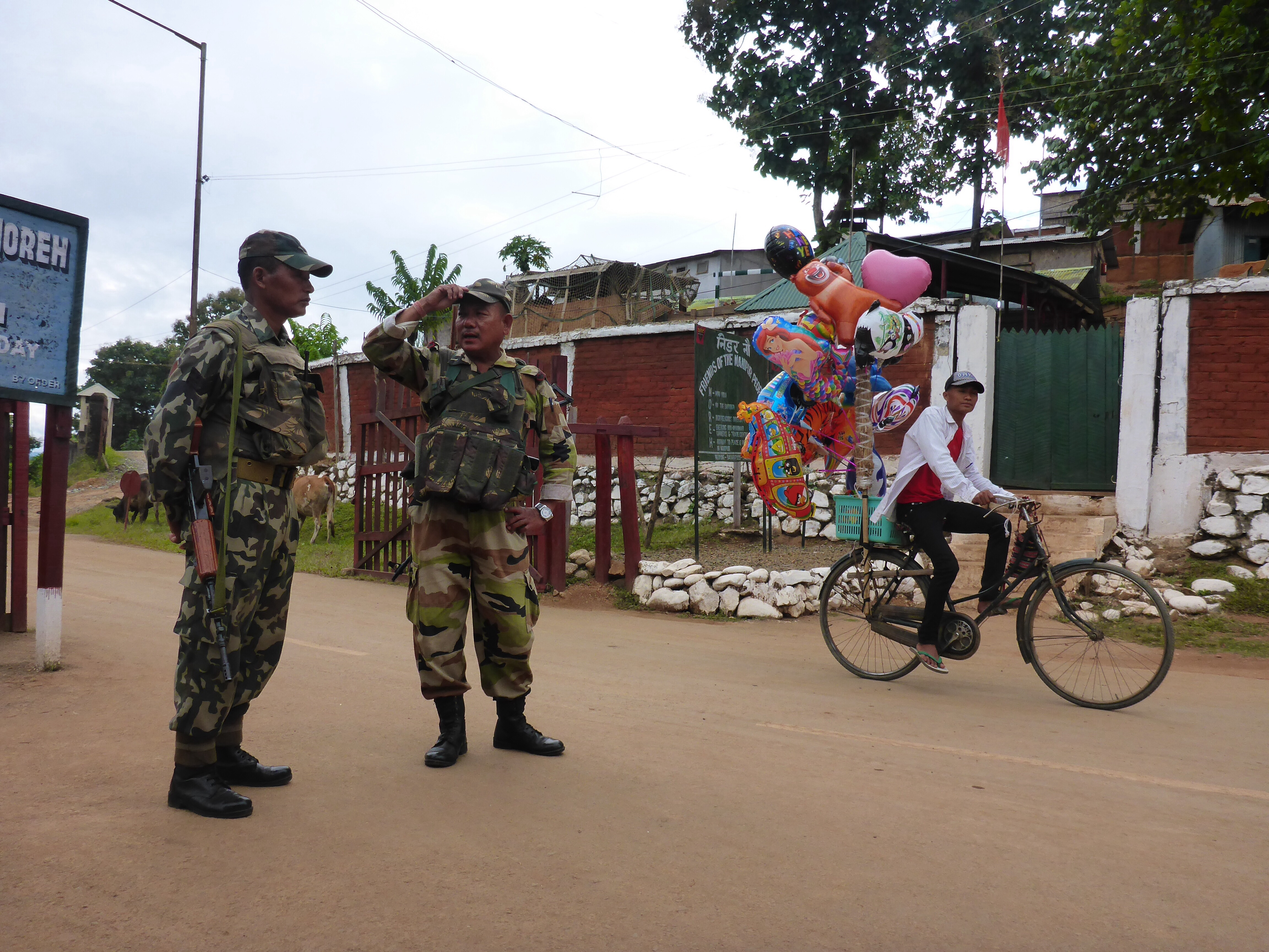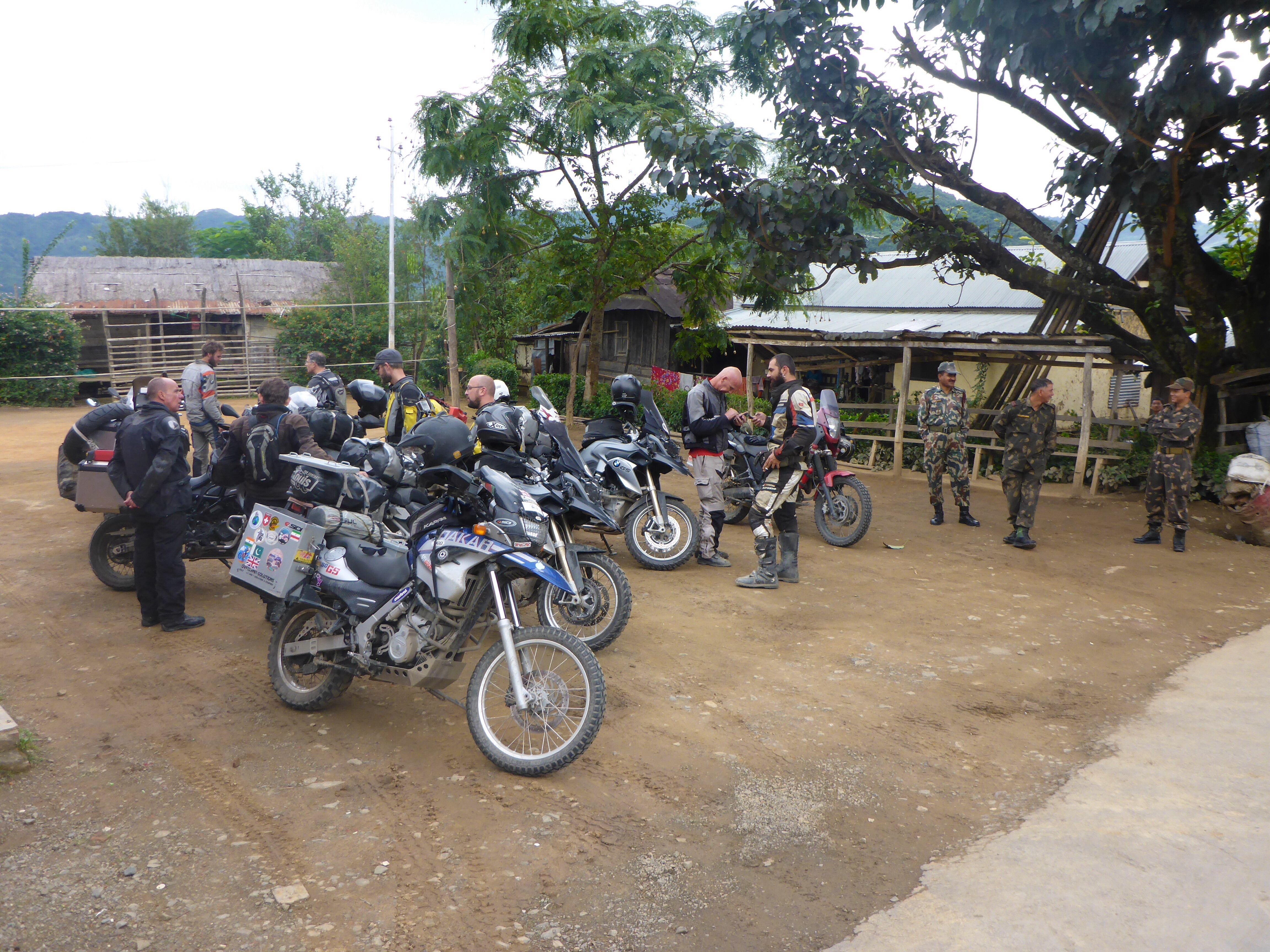 An early start sees us at the Imphal hotel at 06:45, ready to ride to Myanmar. After 3 days of rain and now seeing the sun peeping through the clouds, it is good to be back on Streak and Storm. With our nine travelling companions for our journey through Myanmar, some of whom we had already crossed trails with in West Bengal and Assam, we travel quickly out of Imphal, weaving in and out of small mopeds and motorcycles as our convoy headed south east. The first 40 kilometres fly by as we have a straight road in good condition. What catches our attention is the number of soldiers stationed along the roadside. In some cases only 100 meters apart on either side of the road. They provide security for this road from the various separatist groups which, from time to time, have undertaken attacks and kidnappings. I know little about it, and am not even sure of the current threat state in the area, but we do know it is a volatile area where attacks do occur.