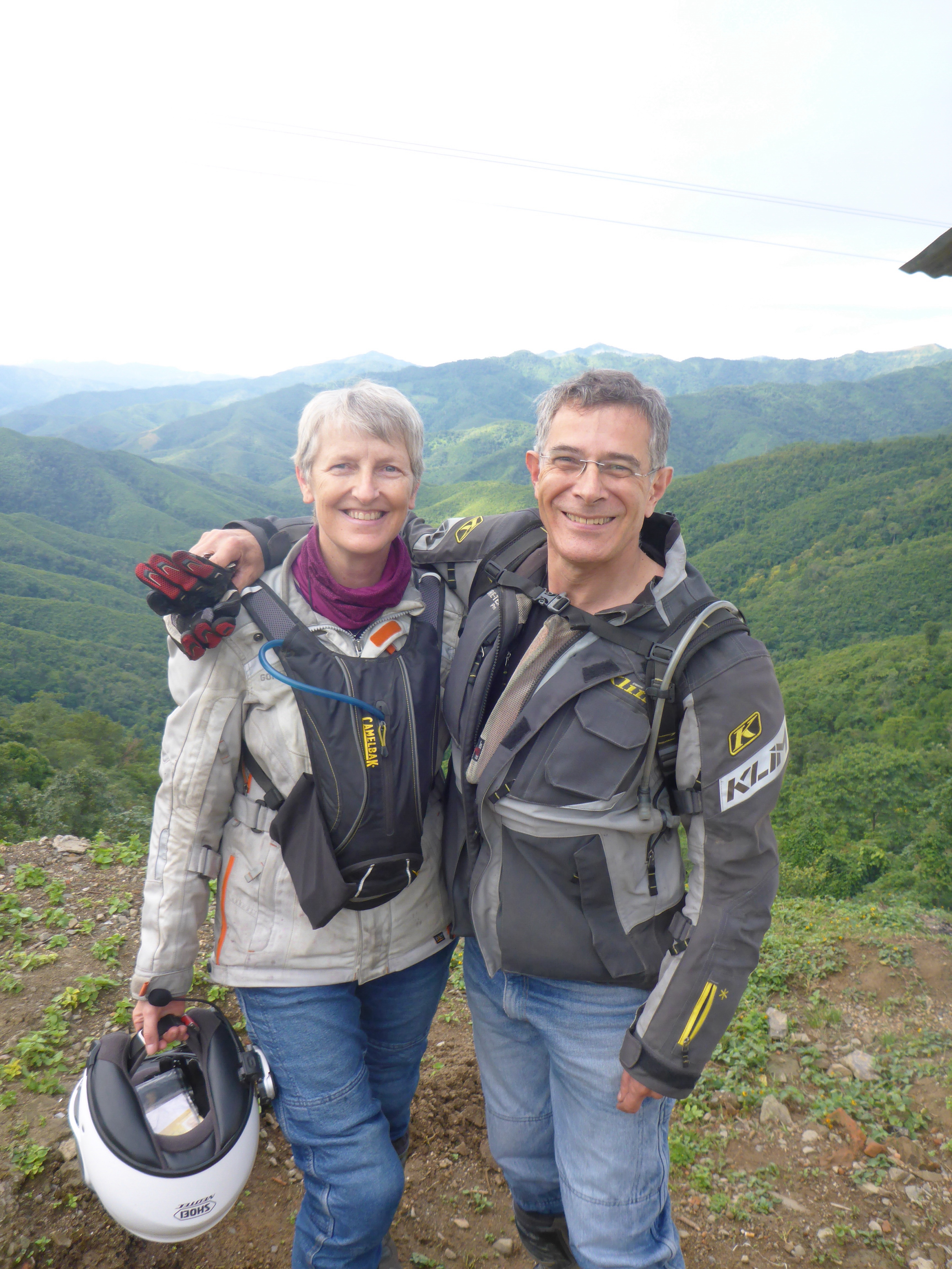 Tar finally turns to good dirt and then, for us dirt road riding novices, dirt tracks, broken tar, and potholes. Anne is suffering from a migraine which makes her efforts all the more impressive. We had been told that this is the good section and worse is to follow. This is proving for both of us to be our most challenging riding yet on this trip. Unlike the sections of dirt in Kazakstan which lasted at most 10 km at a stretch, this seems endless and in fact turns out be be 120 km bad section from the bridge. We have put together a short video that we will post separately that shows some of the road conditions we covered. Suffice to say that on the worst sections there was not even time to think about photos and videos. The road surfaces included wet mud, dry mud ruts, gravel, larger jagged rocks, on a twisty and very steep forest trail. The group with us is great and knowing our lack of experience, wait at a muddy crossing to assist us both through, see on the separate video post. Anne and I both have slow speed ‘offs’ (no personal damage done but Anne did have some impressive bruizes and broke her number plate in two) and Anne eventually succumbed to the migraine, heatstroke and exhaustion and had to take a 15km break – swapping places with one of the pilot car drivers. Anne’s first comment on rejoining the group was that she was so annoyed at not having ridden the whole road. She is still disappointed but knows she made the right decision at the time. Many said it was one of the most difficult riding days they’d ever had. All said and done we are glad we did it, but should have been told up front what to expect and plan for. Somehow it helps mentally when you know what to expect, but when the information turns out to be incorrect, it makes a difficult journey even harder.