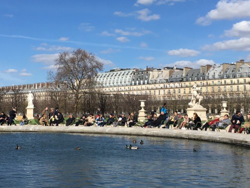 Enjoying the sun by a pond in the Tuileries garden, Paris