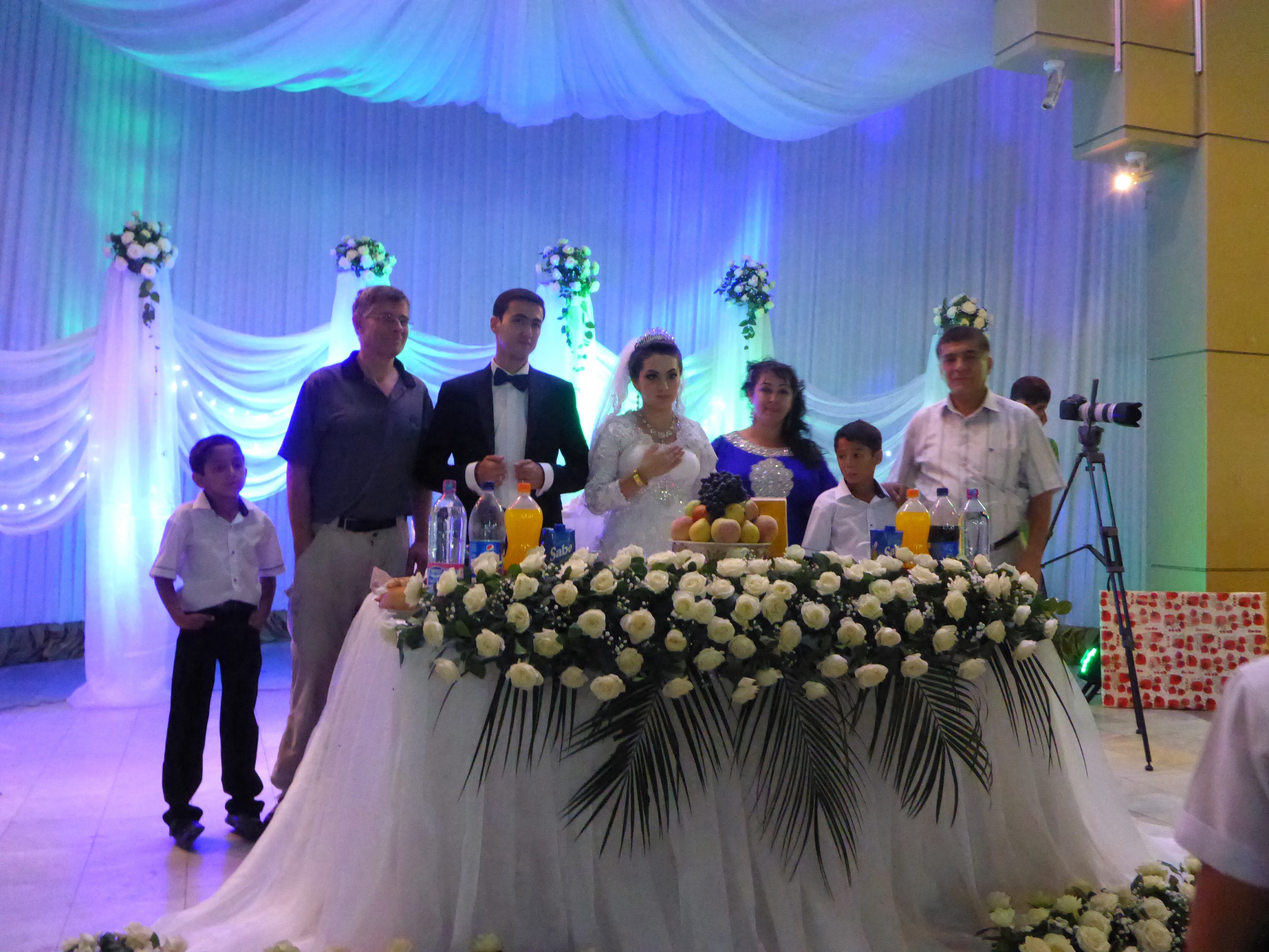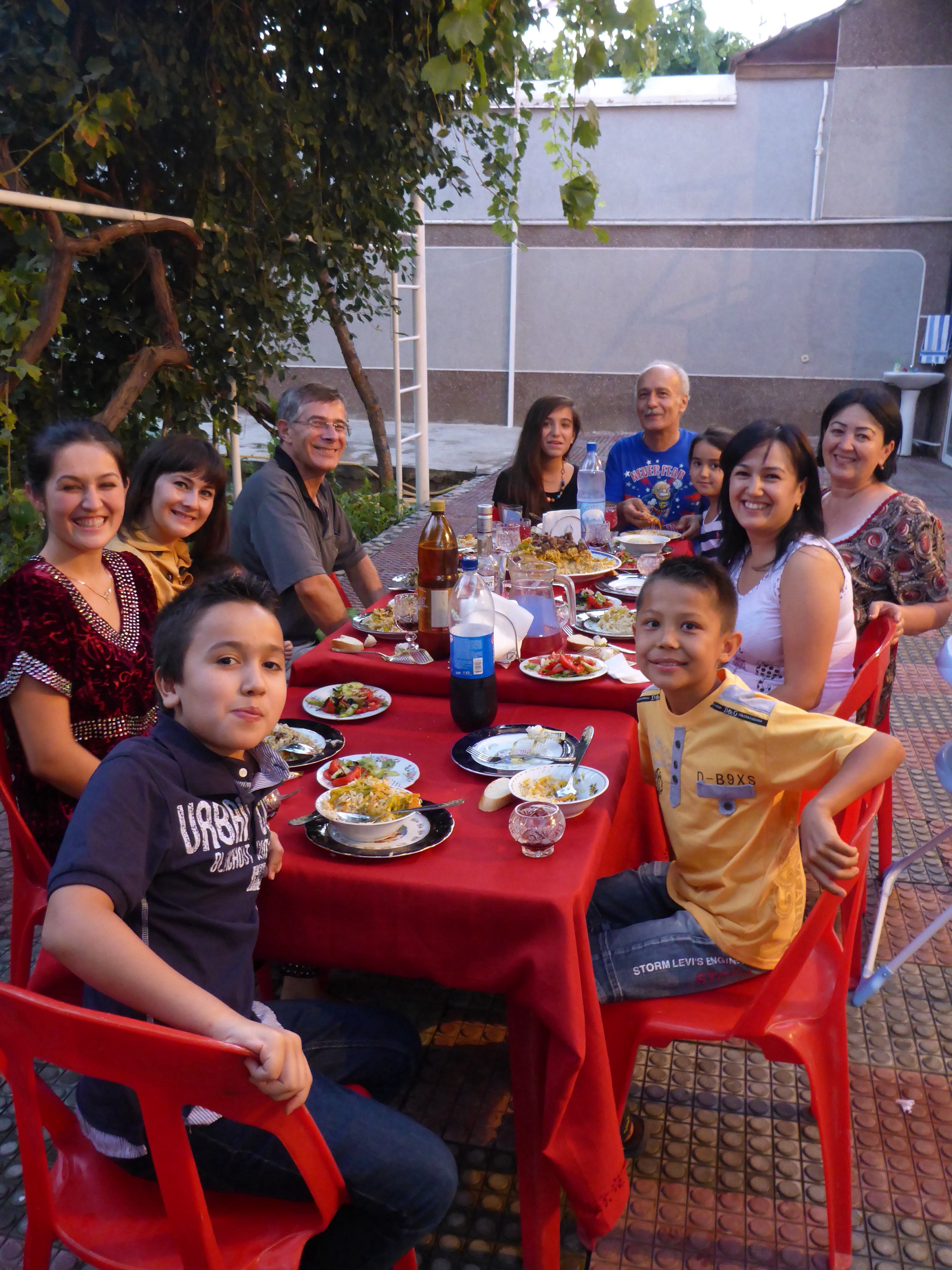 Seeing our friends again was wonderful. The look in Jamkur’s eyes, the sight of him and Anthony walking towards his garden, arms around each other. A special moment. We are greeted with a huge table beautifully decorated. Anthony is invited to Jamkur’s cellar to choose a drink. Anthony picks a ‘port’ while Jamkur has a bottle of vodka. That home brewed fortified wine is amazing: Jamkur made it from the grapes and mulberries in his garden. More and more bowls of fruit, sweets, various delicacies being brought. Eat, eat we are told. Then a huge bowl of soup is served. Then osh, or plov – a local rice, carrot and meat dish. Gradually, the various members of Jamkur’s family arrive, eating as they arrive. Akbar, Aziza’s elder son is our interpreter until Aziza arrives. Each arrival is an excuse for another toast! Any topic is another excuse for another toast. But we don’t throw back a full glass as Jamkur does.