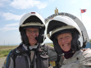 Back on tar after 7 hours to cover the 180kms/110 miles of dirt and we want our driver to return home, it’s a long day’s round trip, so an embankment, truck tyres and the three of us unload Streak and Storm . Back on board our steeds and along side Lake Tolbo then down into Ulgii.