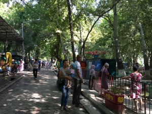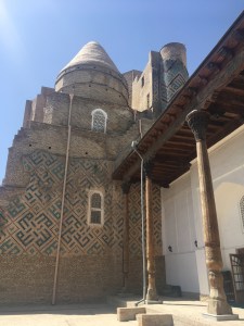 Even though it was long and another stinking hot day, I couldn’t resist going see the Registan again as soon as we arrived!!! We are grateful we have seen this place before in all its glory because it was closed when we arrived for the rehersals of the Music Festival dance routines in a few weeks, with huge platforms, light structures etc. Visiting hours have been reduced to 11am to 4pm. When I visited it again the next day, it didn’t have the same peaceful feel I had remembered from our first visit. It felt more like a work site. I still enjoyed seeing it close up though – the workmanship, the colours, sheer beauty, majesty, balance, and even the serenity was still there in places. I felt sorry for first time tourists though. I went back again the next day for a leisurely stroll. Here are a few photos – I had to restrain myself!!