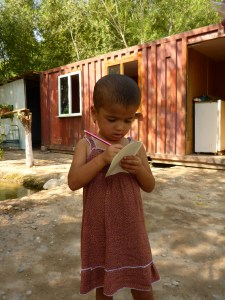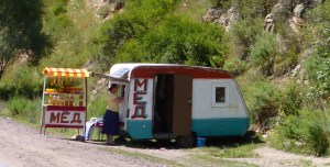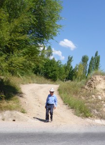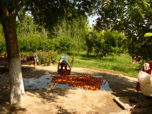 Seeing our friends again was wonderful. The look in Jamkur’s eyes, the sight of him and Anthony walking towards his garden, arms around each other. A special moment. We are greeted with a huge table beautifully decorated. Anthony is invited to Jamkur’s cellar to choose a drink. Anthony picks a ‘port’ while Jamkur has a bottle of vodka. That home brewed fortified wine is amazing: Jamkur made it from the grapes and mulberries in his garden. More and more bowls of fruit, sweets, various delicacies being brought. Eat, eat we are told. Then a huge bowl of soup is served. Then osh, or plov – a local rice, carrot and meat dish. Gradually, the various members of Jamkur’s family arrive, eating as they arrive. Akbar, Aziza’s elder son is our interpreter until Aziza arrives. Each arrival is an excuse for another toast! Any topic is another excuse for another toast. But we don’t throw back a full glass as Jamkur does.